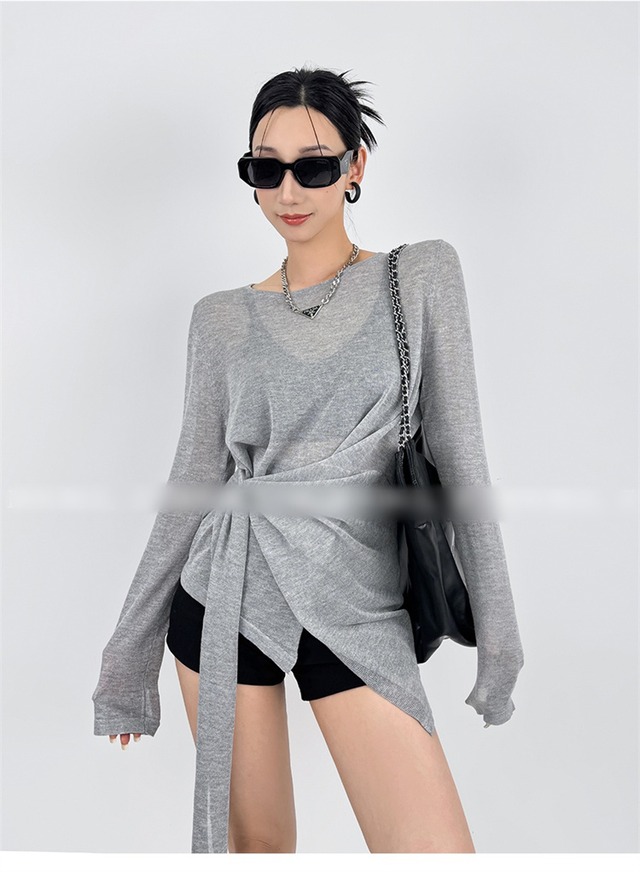軽量素材 UVカット加工 ニットソー アシンメトリー開襟 ヒモ付き レイヤード対応 サマー向けトップス