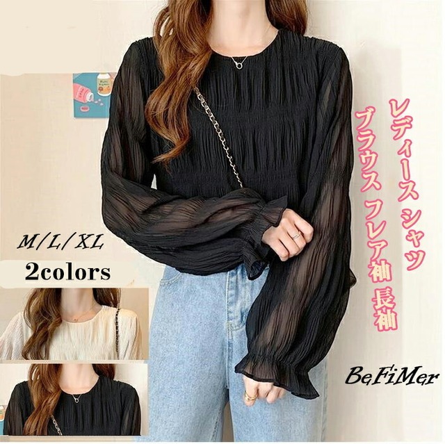 【春秋新作】レディース 長袖 ブラウス ギャザー 透け感 フリル レース 春秋