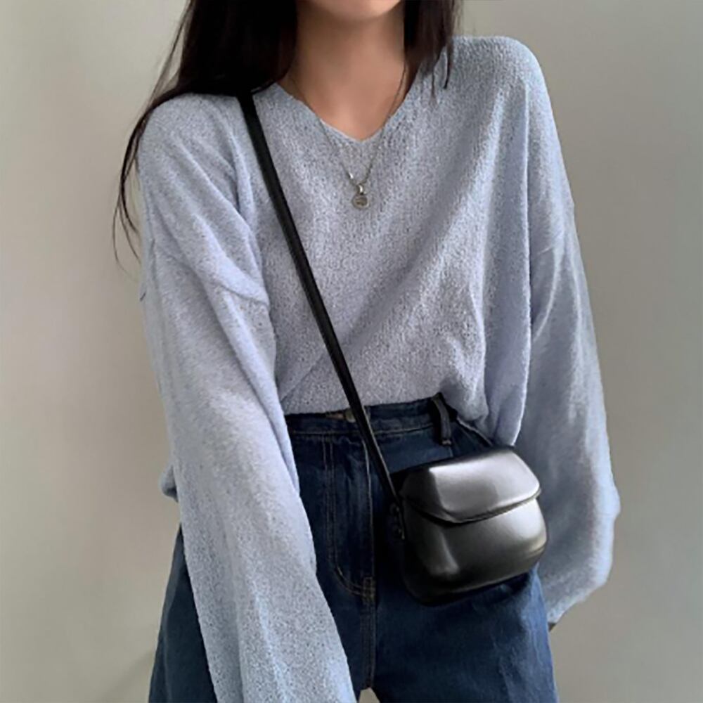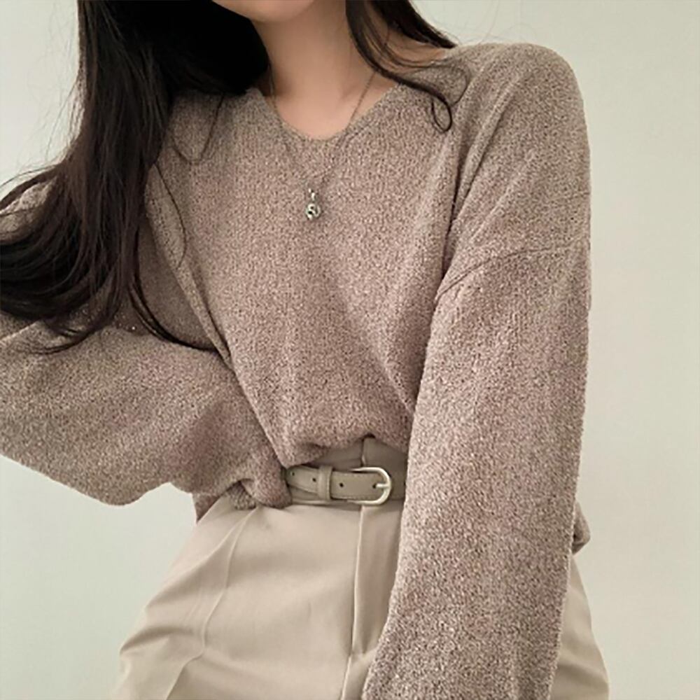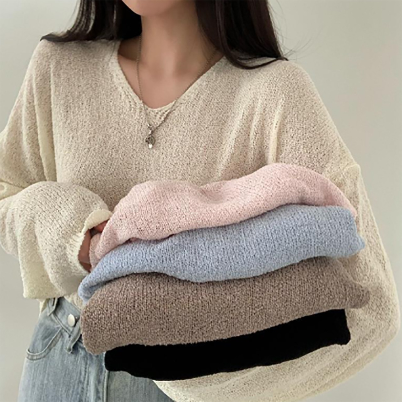 このサマーニットは、軽やかな素材感が特徴で、薄手ながらもしっかりとした作り。Vネックの長袖仕様は、カジュアルでありながらも女性らしい魅力を引き立てるポイントです。透け感がありつつも、着る人を選ばず、普段使いからリゾートシーンまで幅広く活躍できるアイテムです。