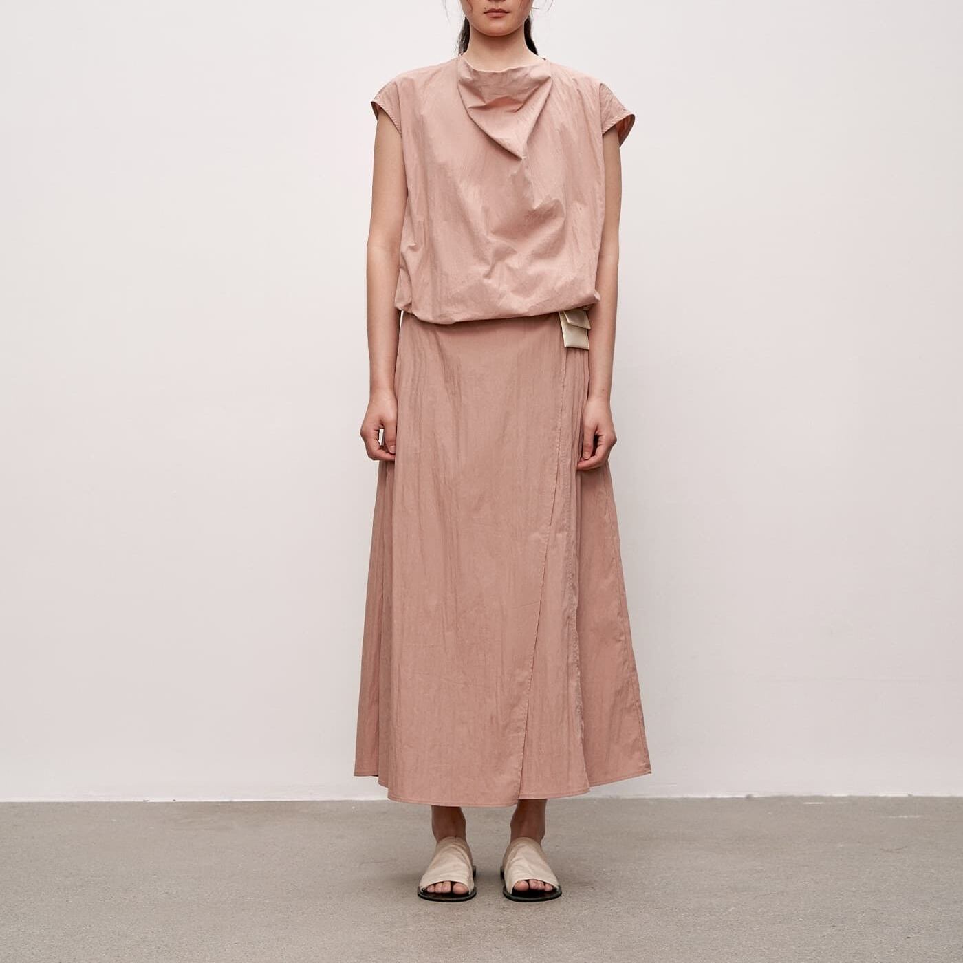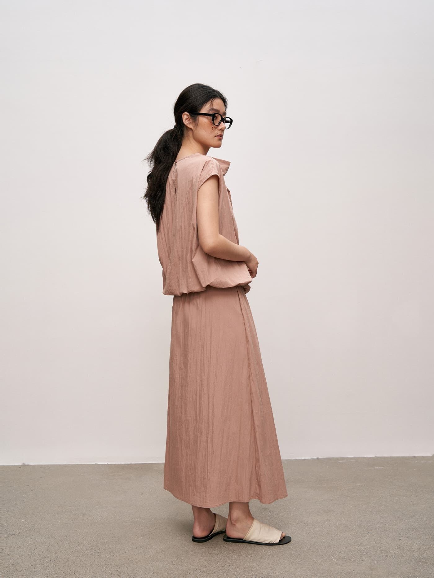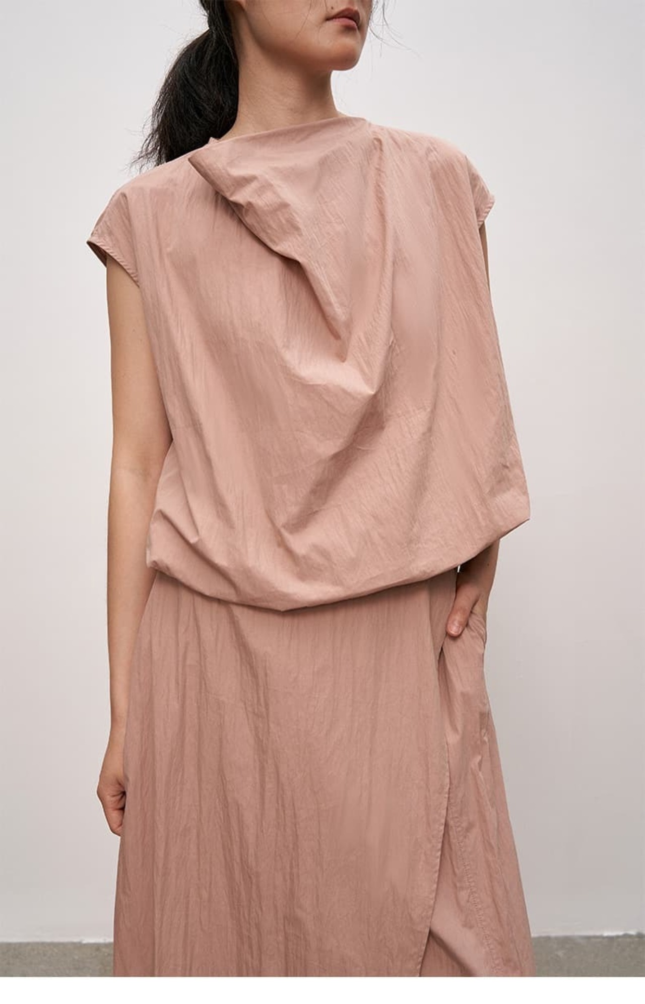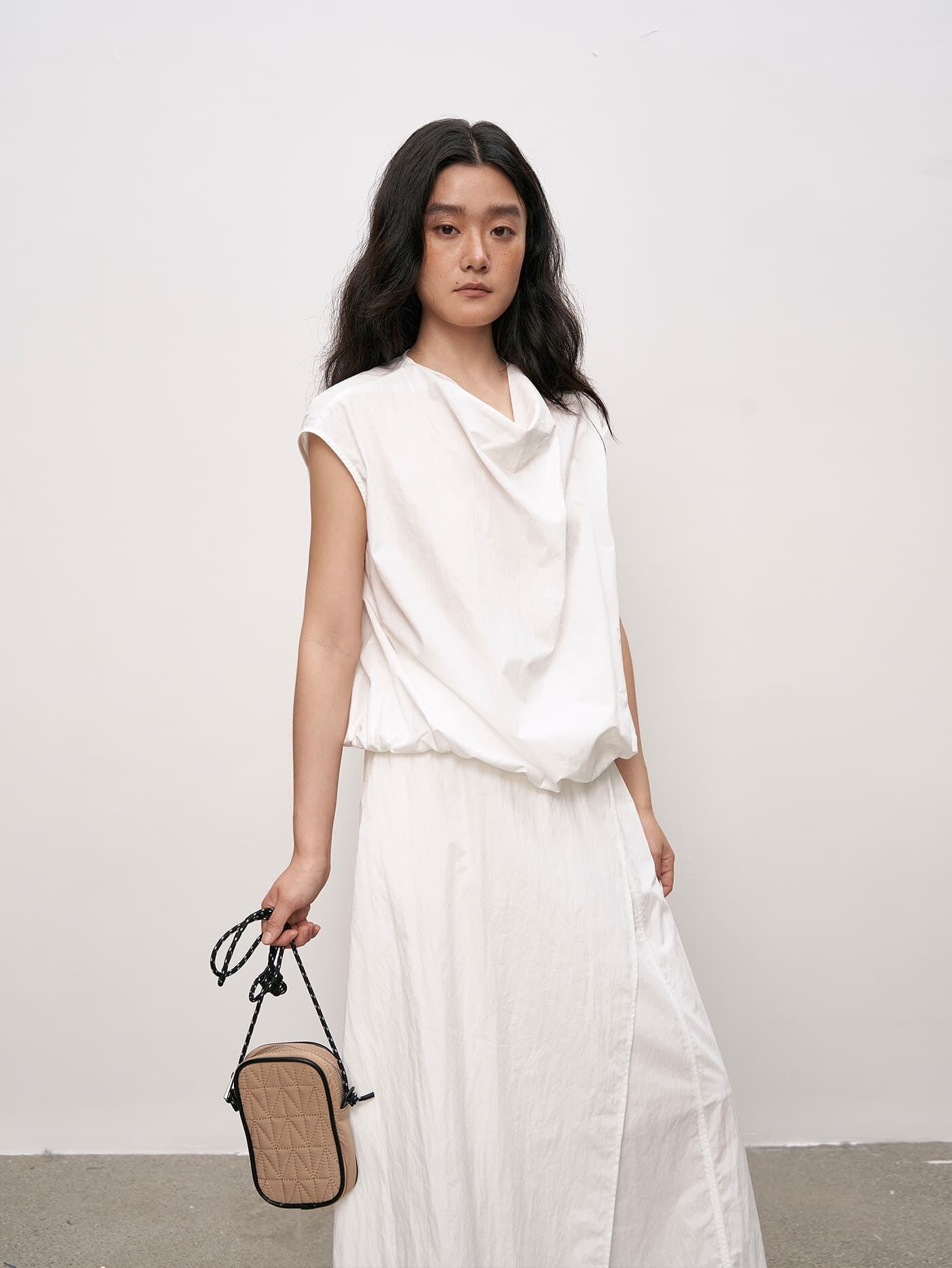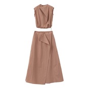 2025年春夏の新作、シーズントレンドを感じさせるレディースのトップス二点セットが登場!ノースリーブのベストとスカートの組み合わせは、カジュアルから特別なシーンまで幅広く活用できるスタイルを実現しています。