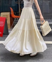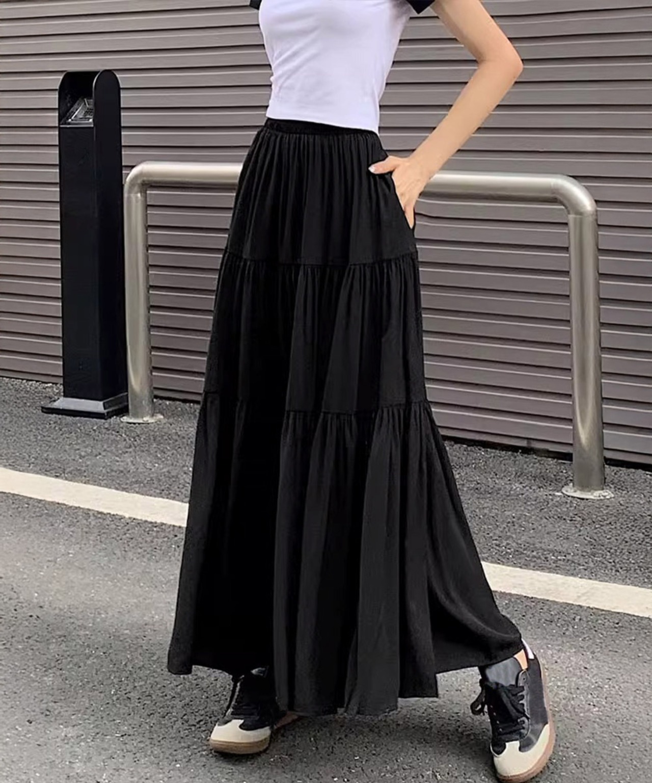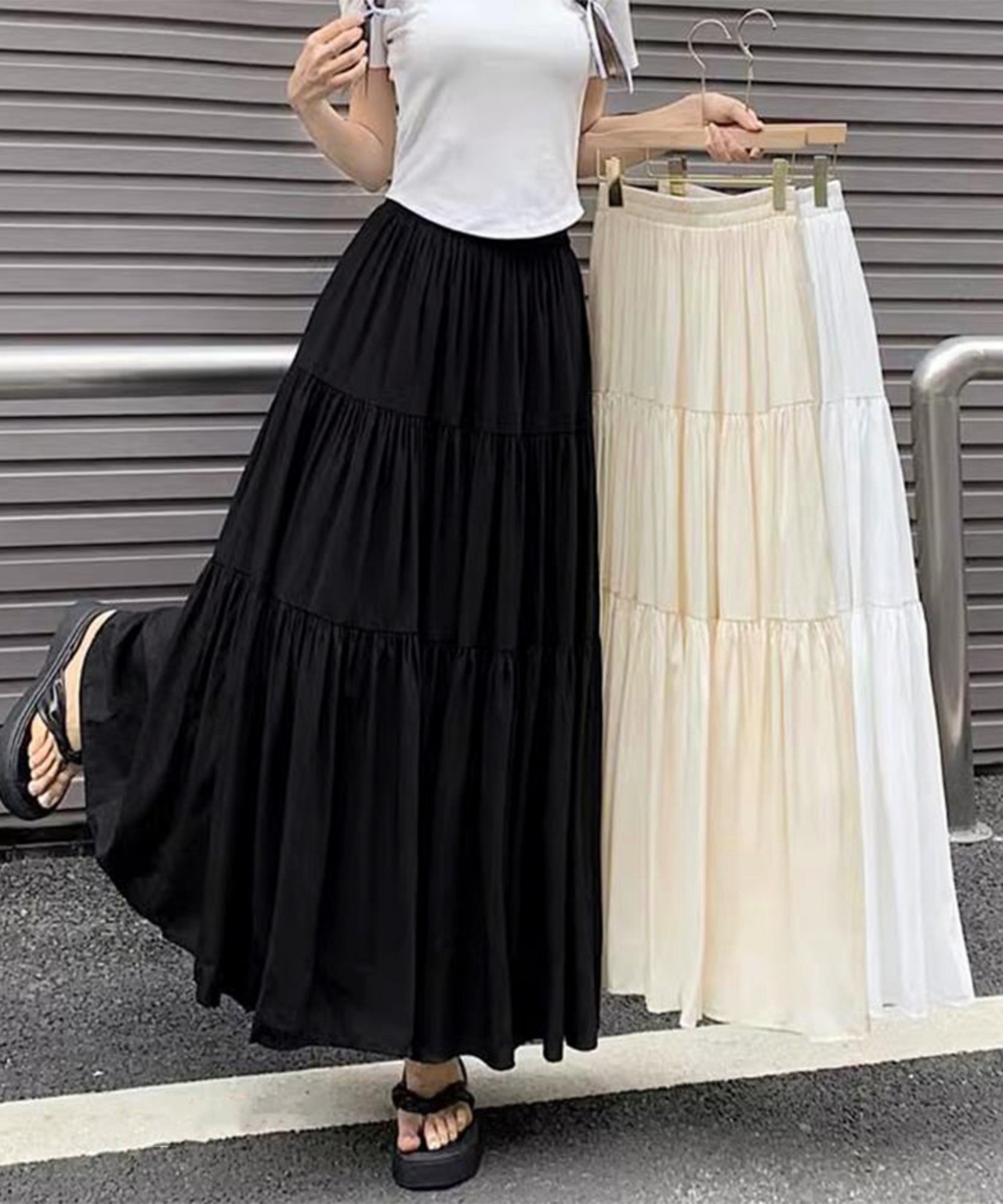 ハイウエストプリーツスカート 体型カバーボトムス ウエストゴム 切り替えフレアスカート きれいめ大人可愛いマキシスカート