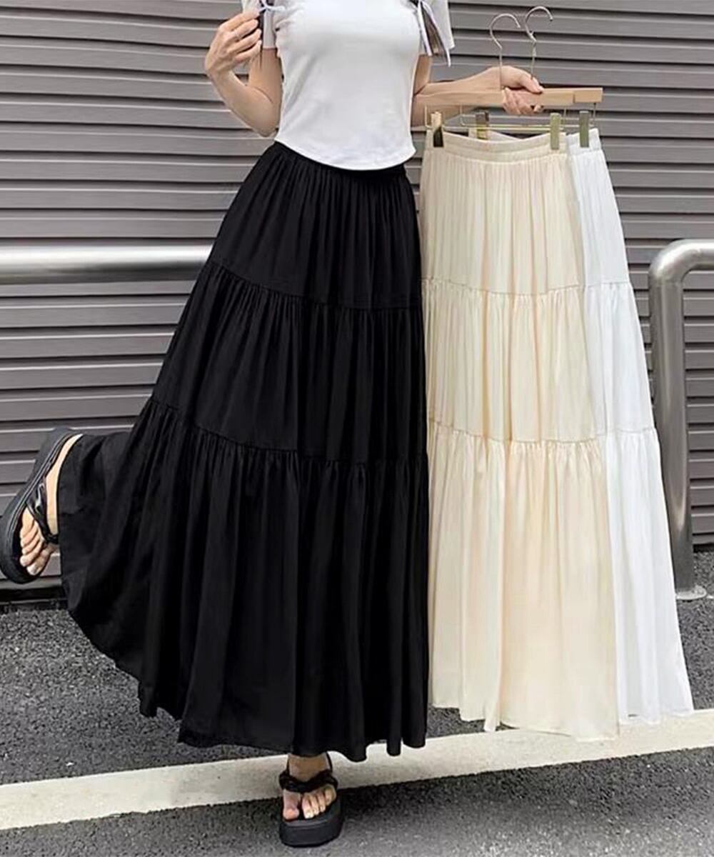 軽やかな生地感と柔らかなプリーツが、動くたびに美しい揺れ感を演出するフレアロングスカート
