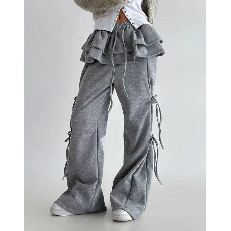 リボン付きでウエスト調整可能 カジュアルコーデ 韓国風ファッション おしゃれなボトムス 美脚見え ワイドパンツ