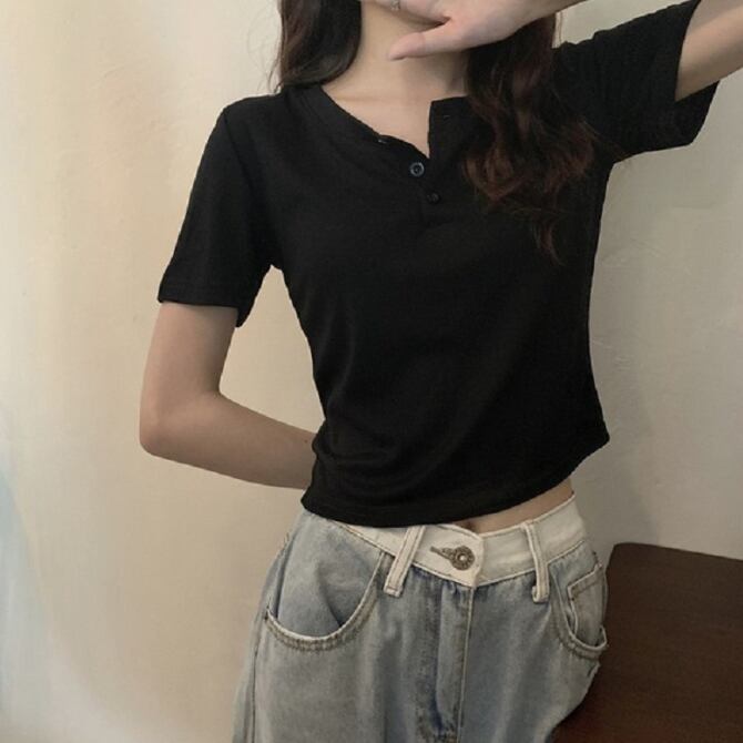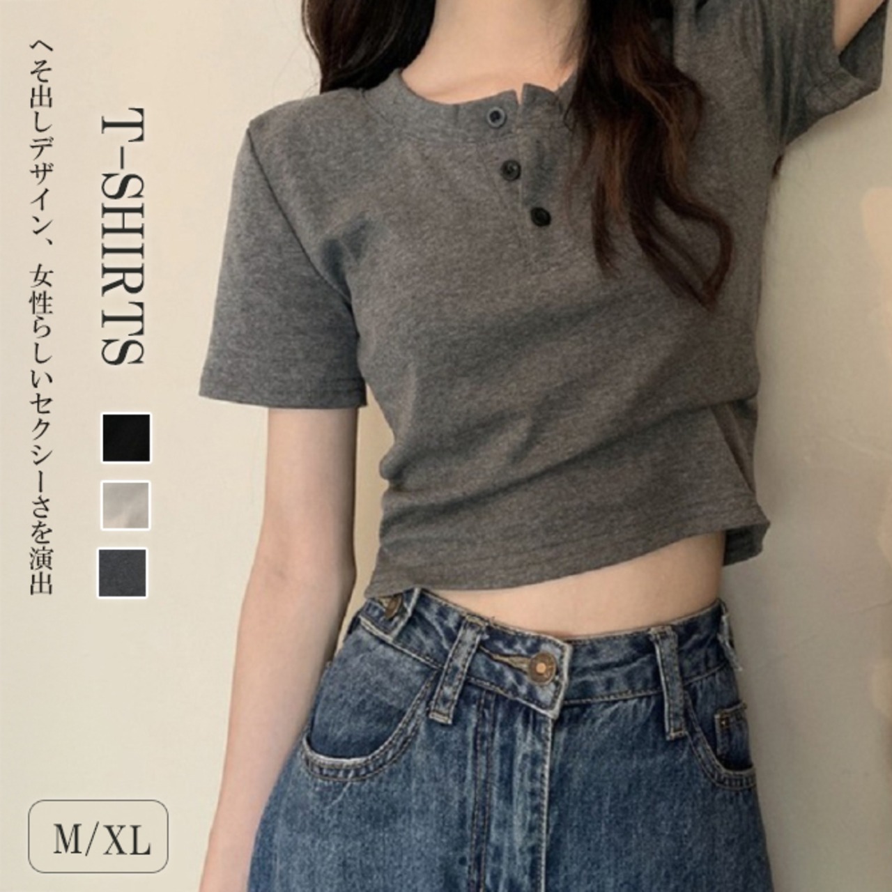 ショート丈なのでへそ出しコーデをすることができ、女性らしいセクシーさを出してくれる 半袖ニット