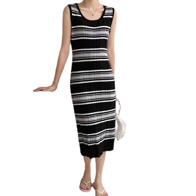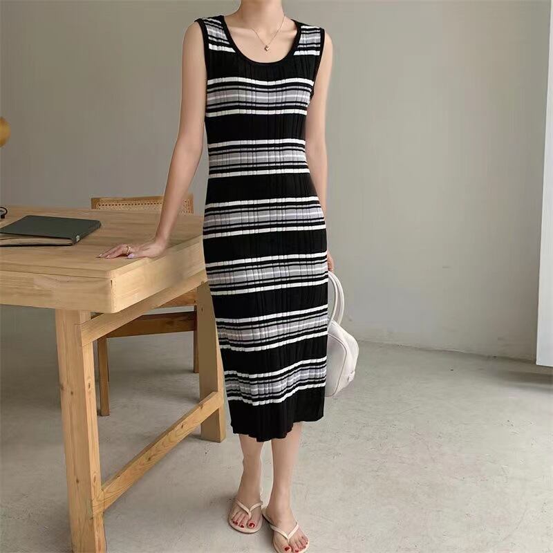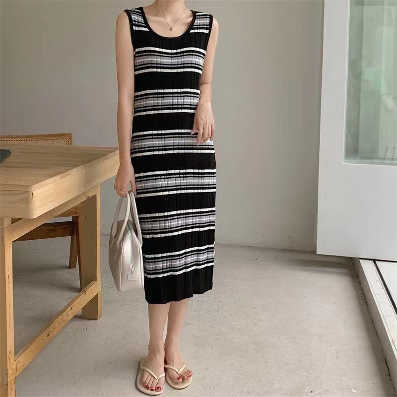 2025新作 レディース ニットワンピ ノースリーブ タンクワンピ インナー ロング丈 マルチボーダー おしゃれ | Fashionshop Kuuu571 |StylishでおしゃれなFashion好きな人達へ