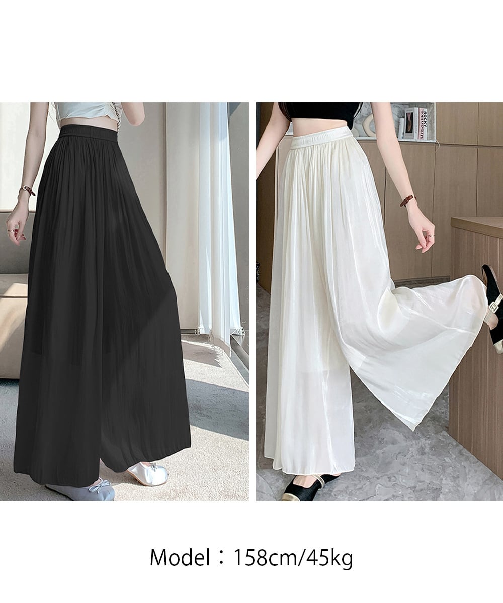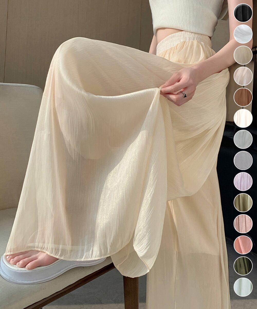 春夏に映える、なめらかな光沢感が魅力のシアーワイドパンツ。