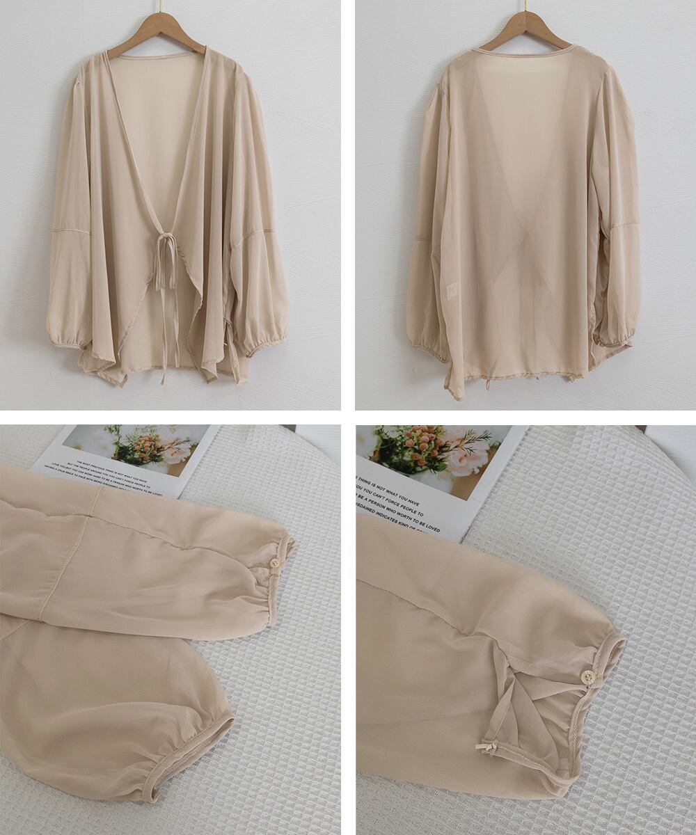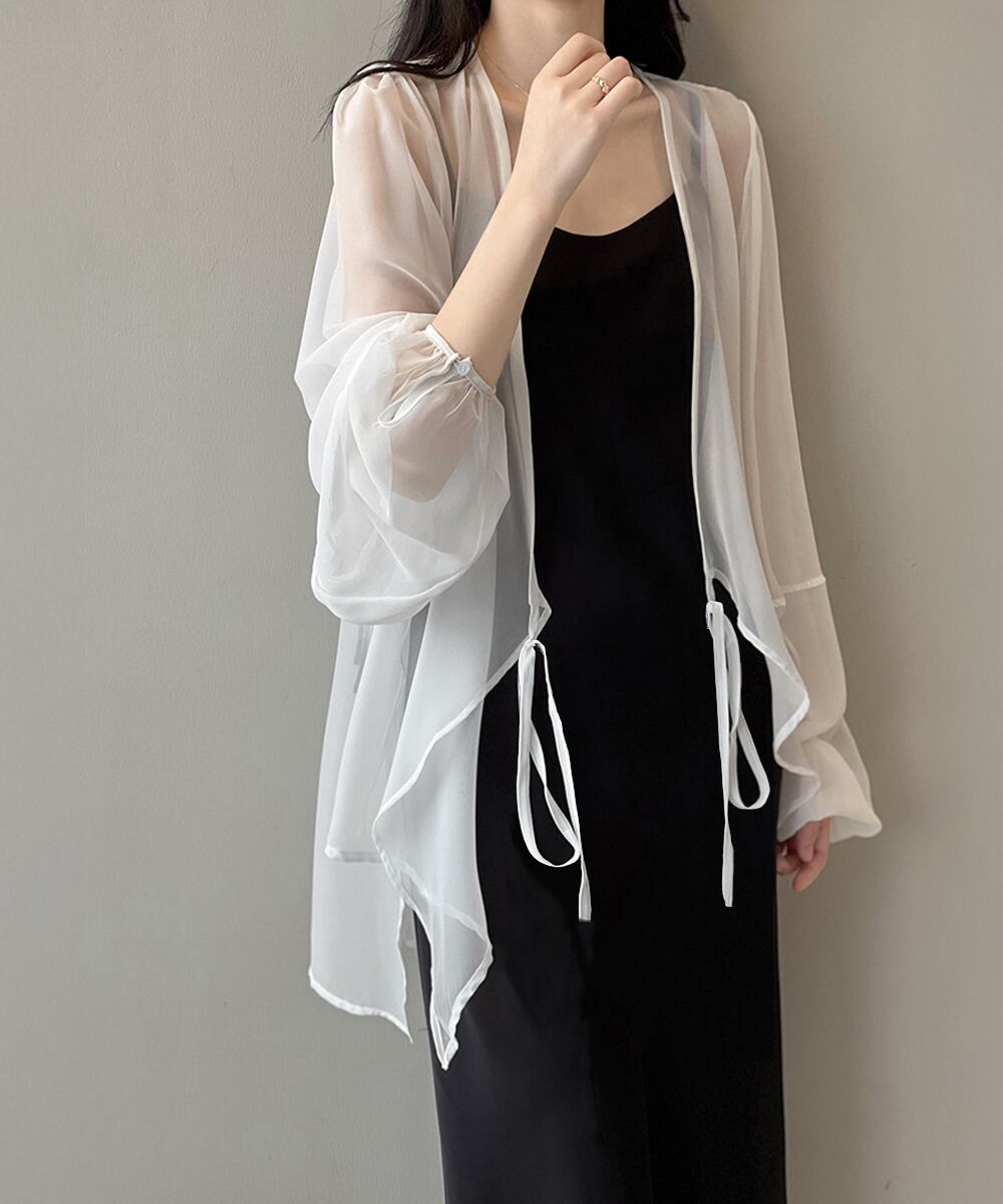 このシアーカーディガンは、春夏のライトアウターとして重宝します!前開きのデザインで着脱も簡単、リボンのディテールがアクセントになり、こなれた印象を与えます。日焼け防止効果もあり、テラスやビーチでのリラックスタイムにも最適です。軽やかな雰囲気を持つこのカーディガンを、ぜひおしゃれなコーディネートに取り入れてみてください!