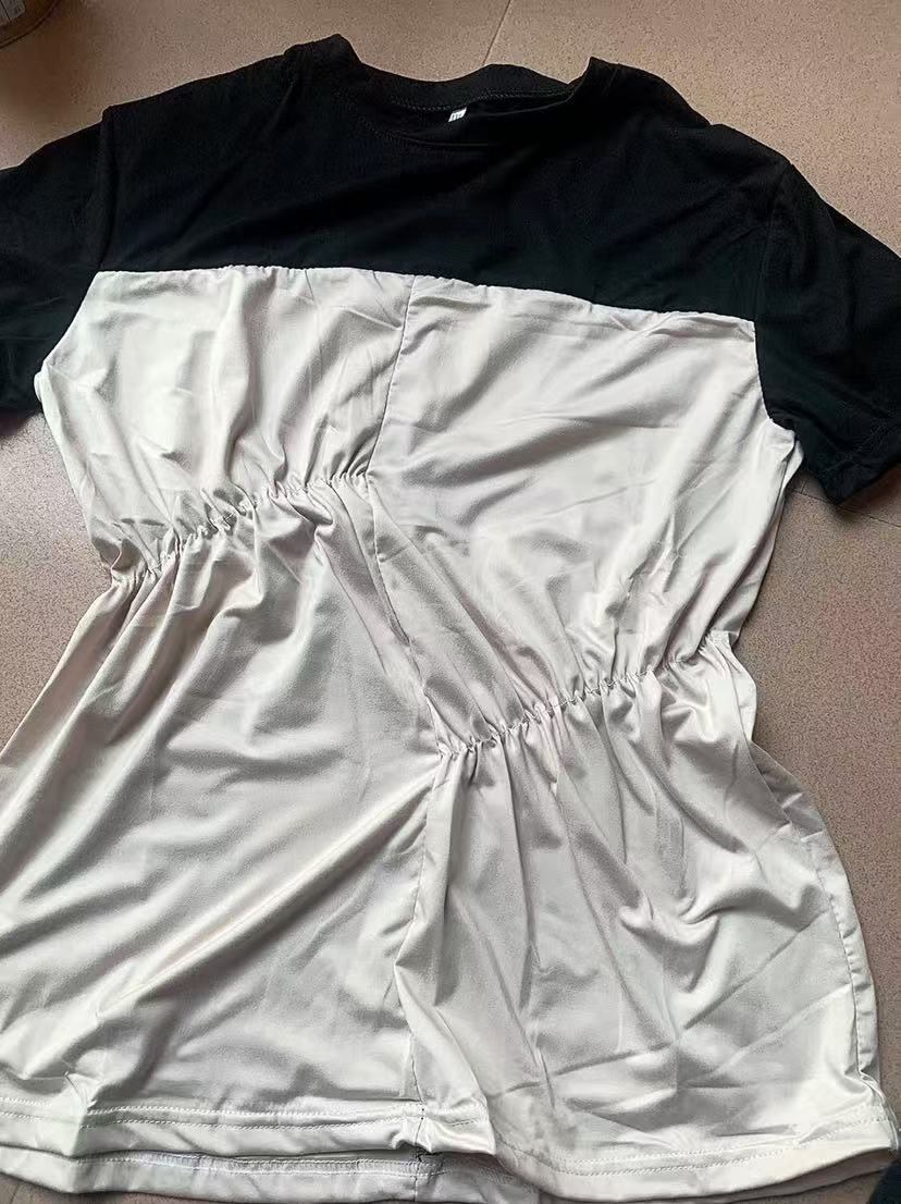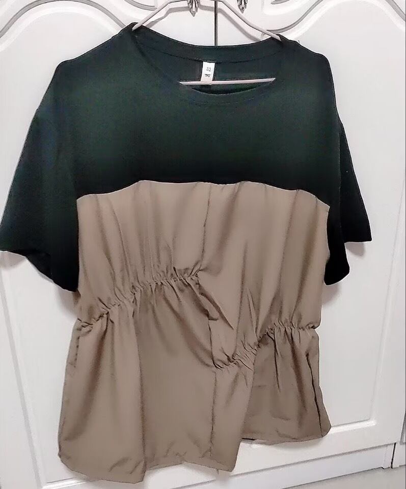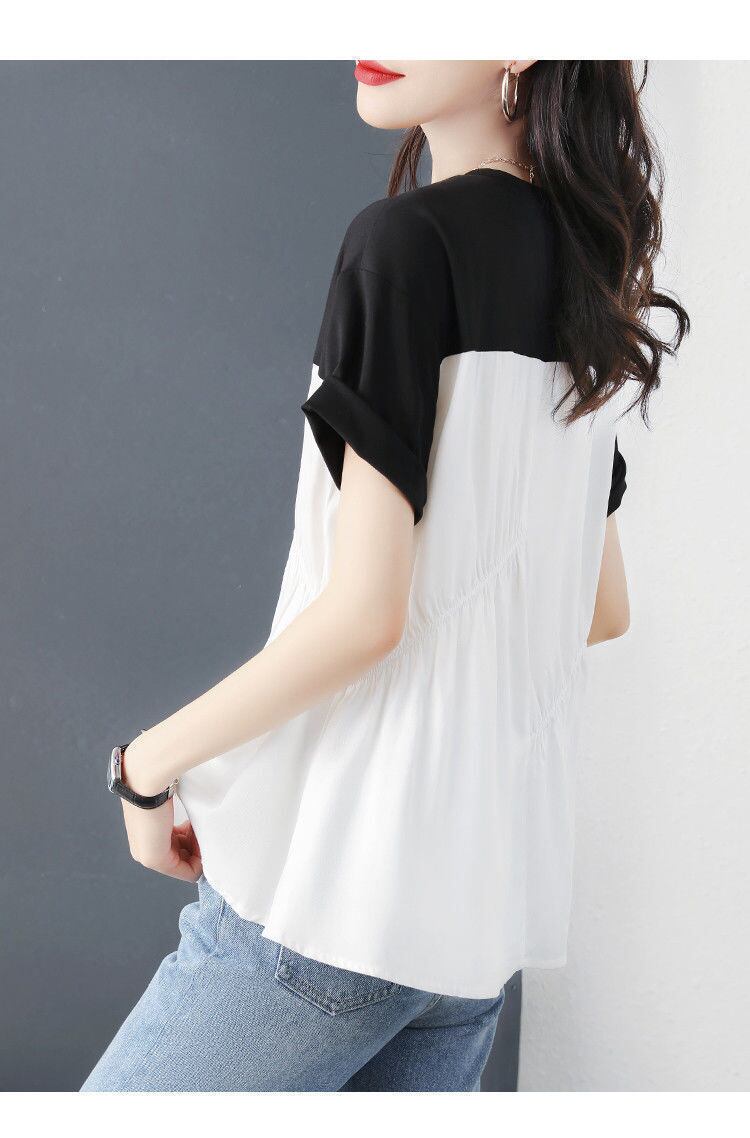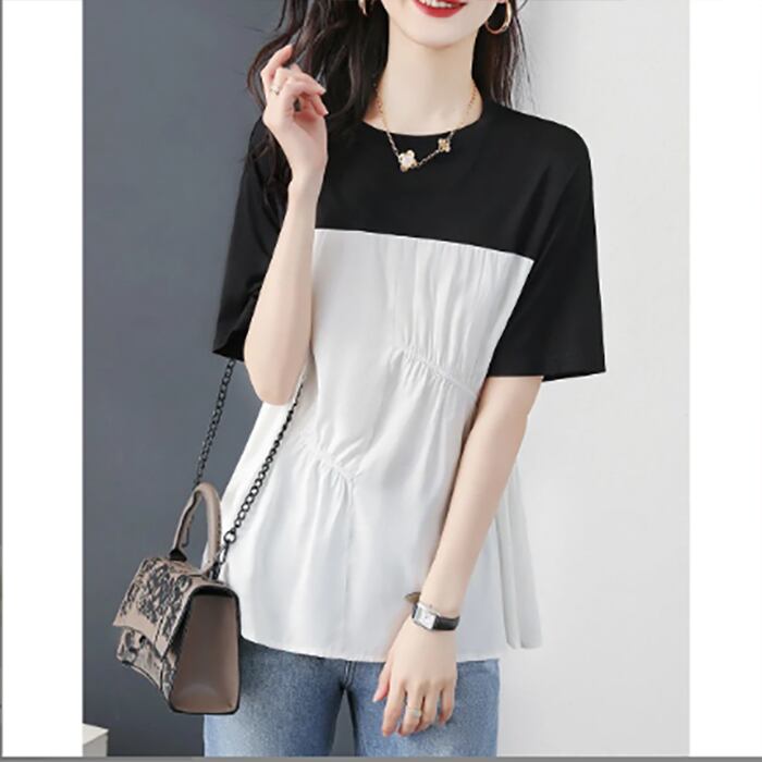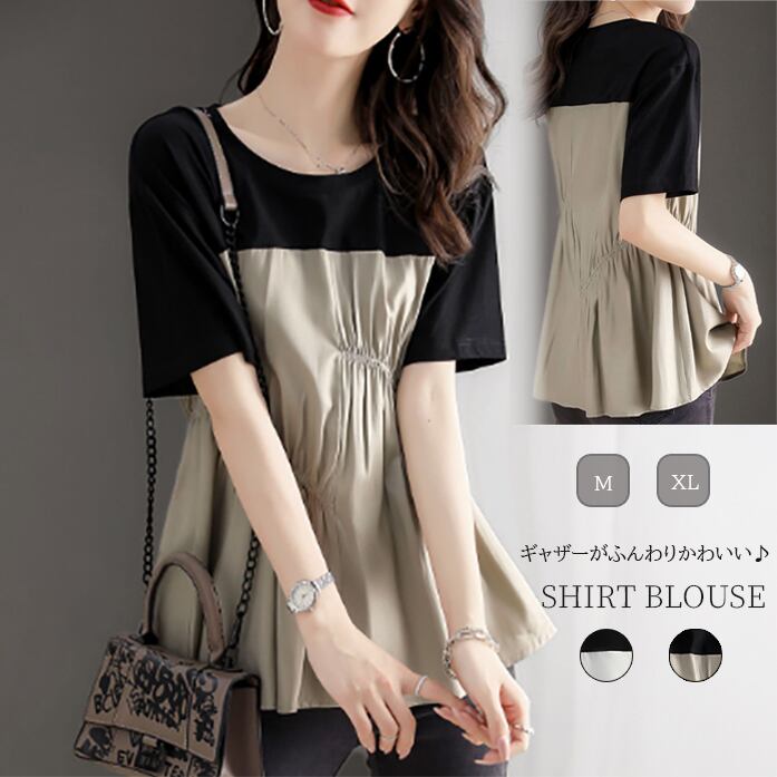 2025新作 クルーネック tシャツ ブラウス ギャザー 配色 異素材 切り替え カジュアル 半袖 体型カバー | Fashionshop Kuuu571 |StylishでおしゃれなFashion好きな人達へ