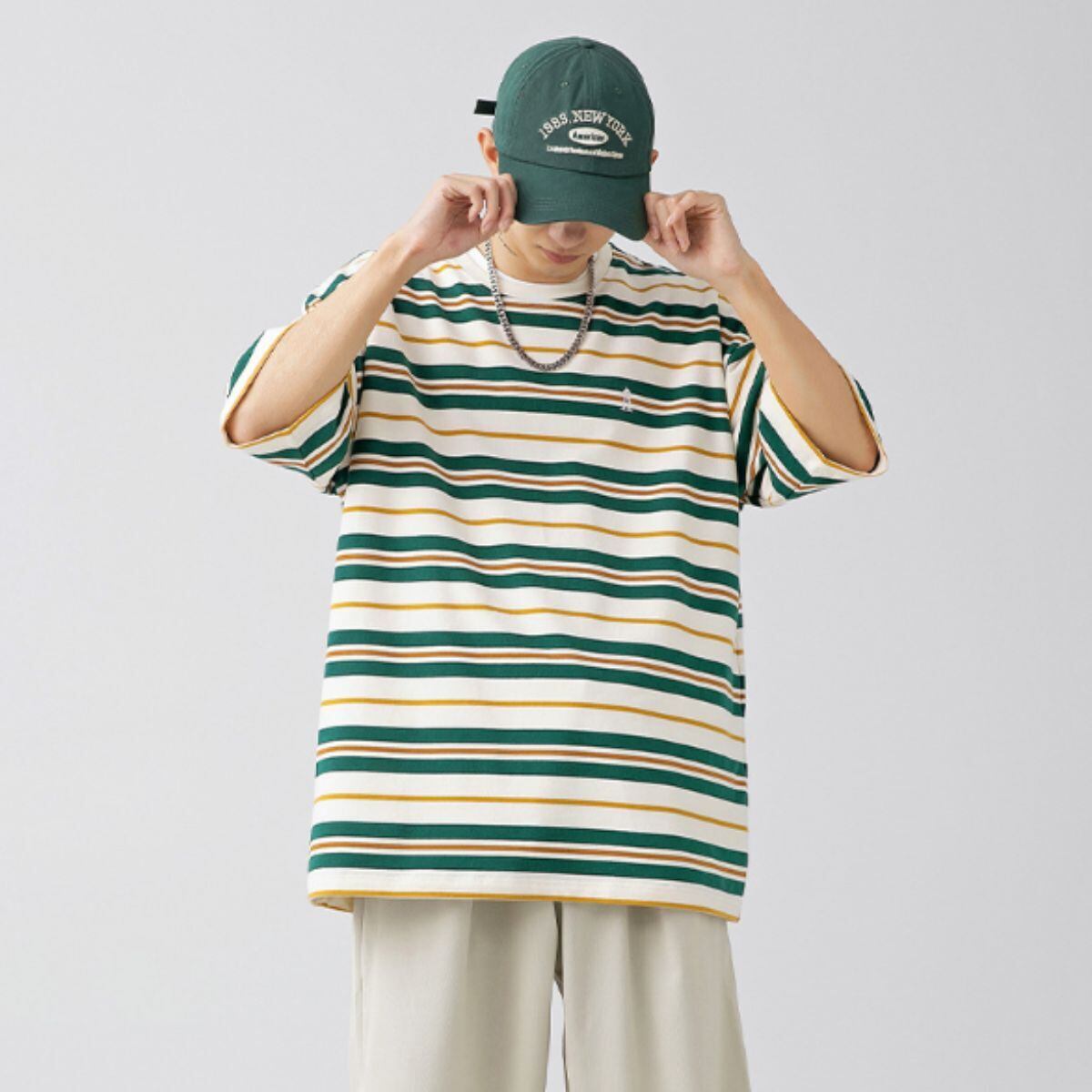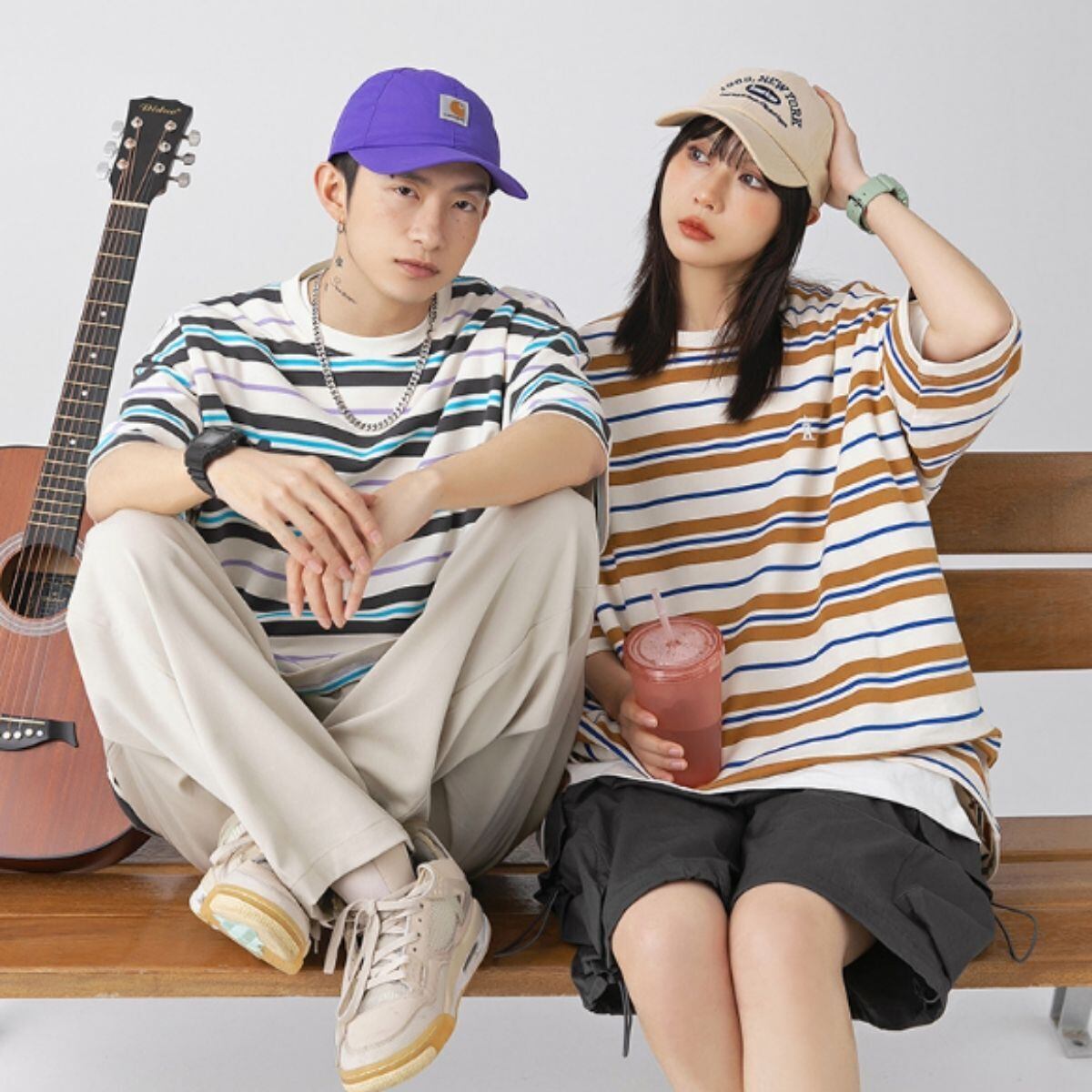 マルチボーダーが魅力的な半袖Tシャツは、ユニセックスデザインで誰でも気軽にスタイルアップできるアイテムです。ビッグシルエットはリラックスした着こなしを実現し、ゆったりとした着心地を提供します!このTシャツは、韓国ファッションの要素を取り入れ、ストリートスタイルに最適な一枚です。