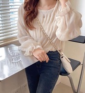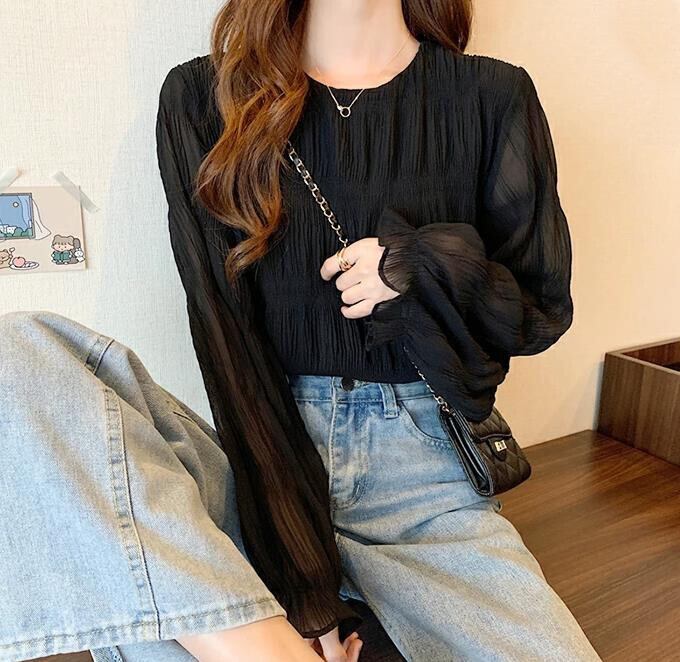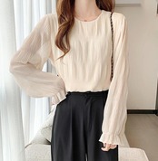 美しいギャザーと繊細なレースが施された長袖ブラウスが登場しました。このブラウスは、透け感のある素材とフリルが特徴で、華やかさをプラスしつつも上品な印象を与えてくれます!これ1枚で、パーティーからデイリーユースまで幅広く対応できるアイテムです。
