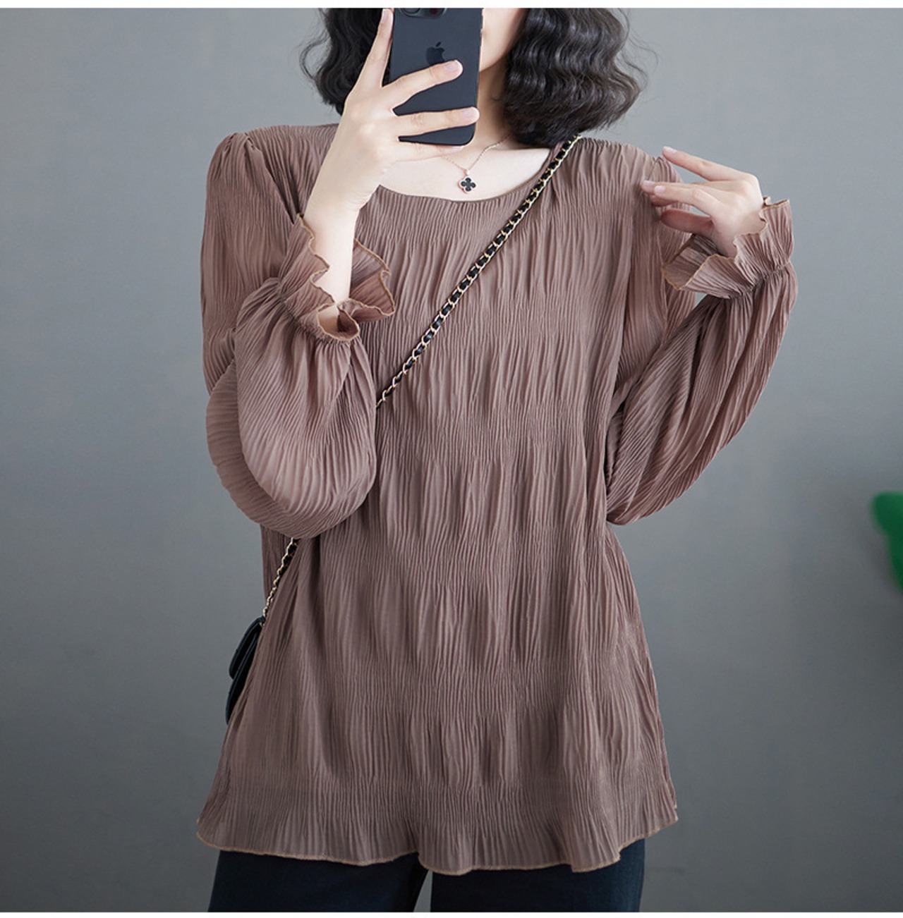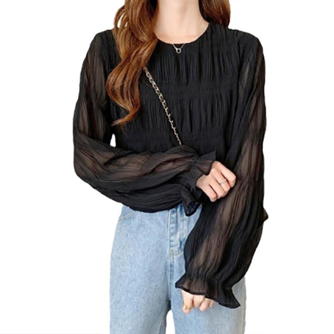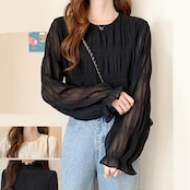 ・袖のシアー感と、くしゅっとしたギャザー感がフェミニンなシャーリングブラウス。