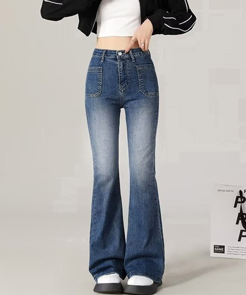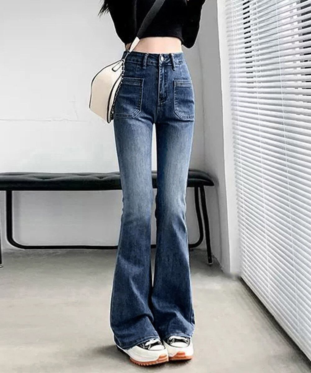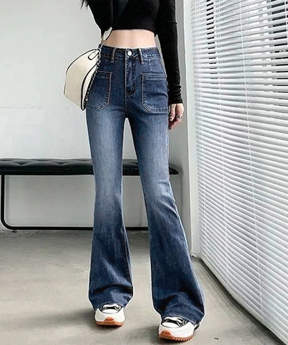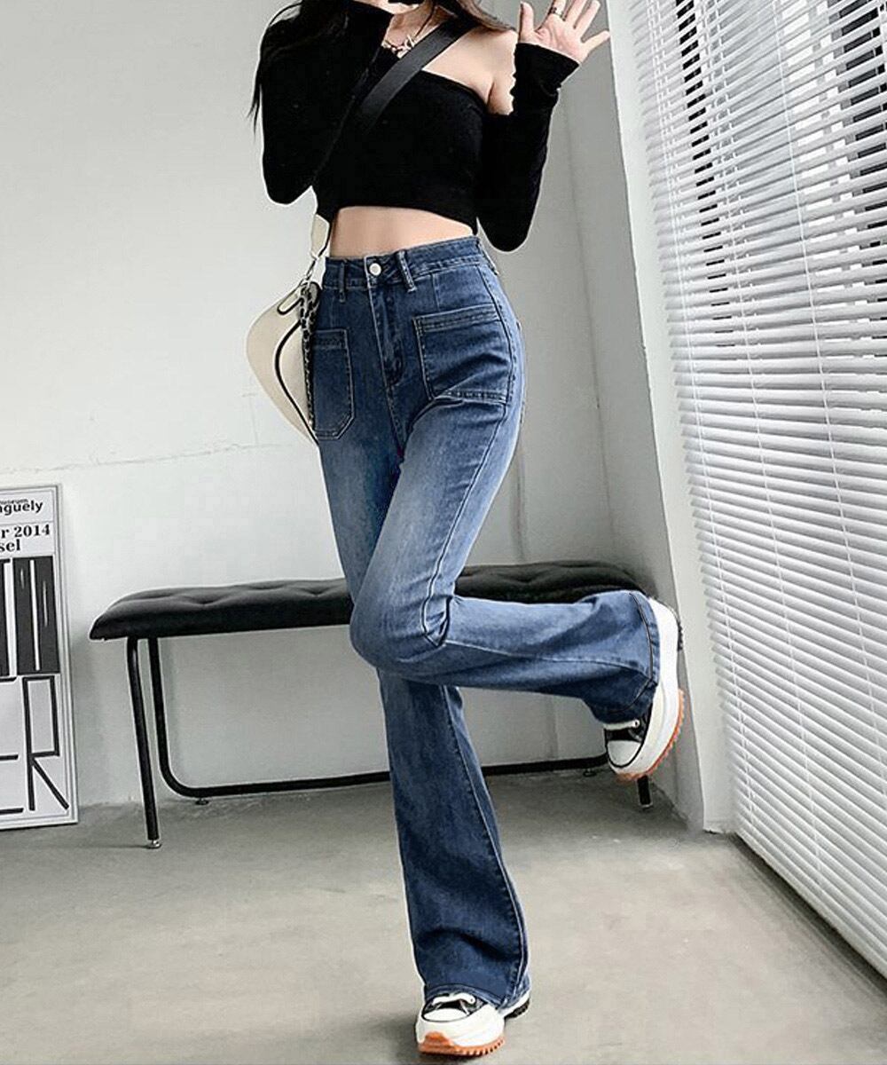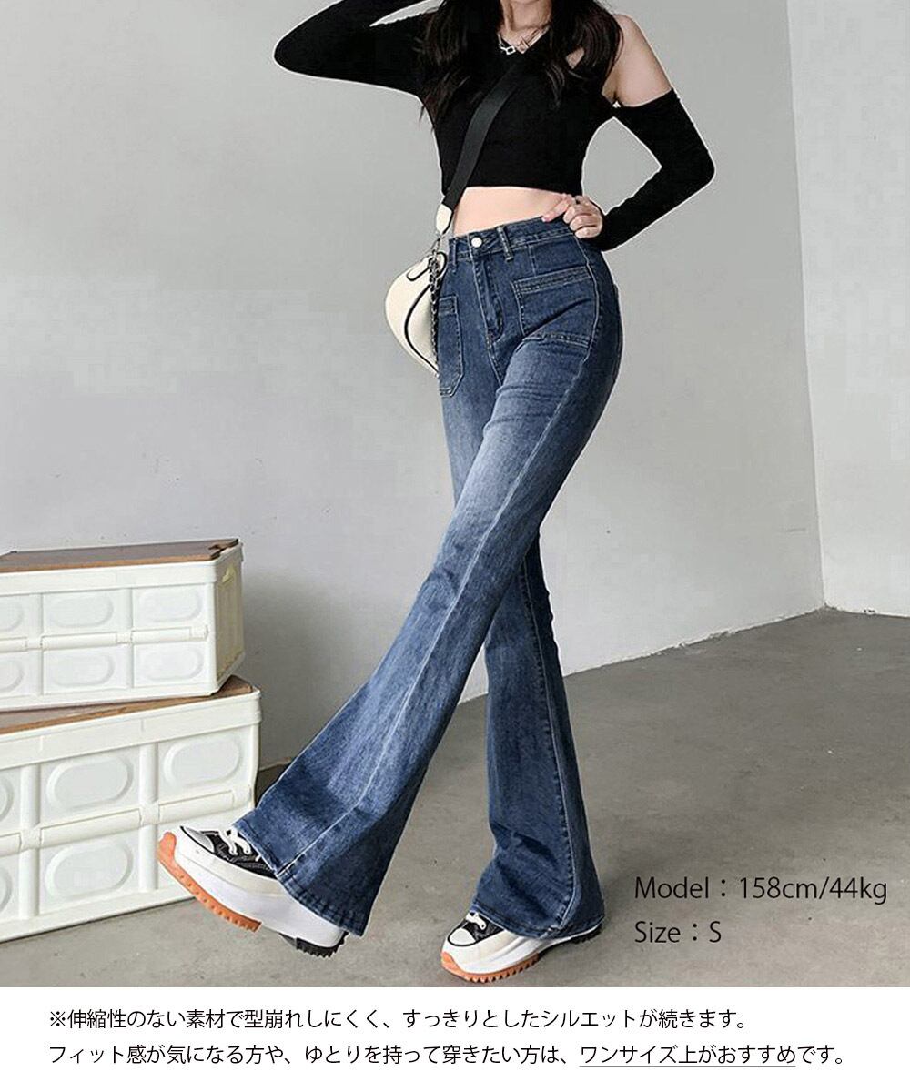 シンプルでカジュアルからきれいめまで幅広く対応。ハイウエストで脚をすっきり見せてくれるセミフレアデニムパンツ。