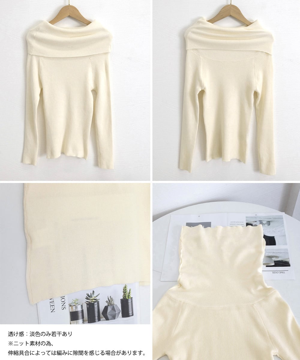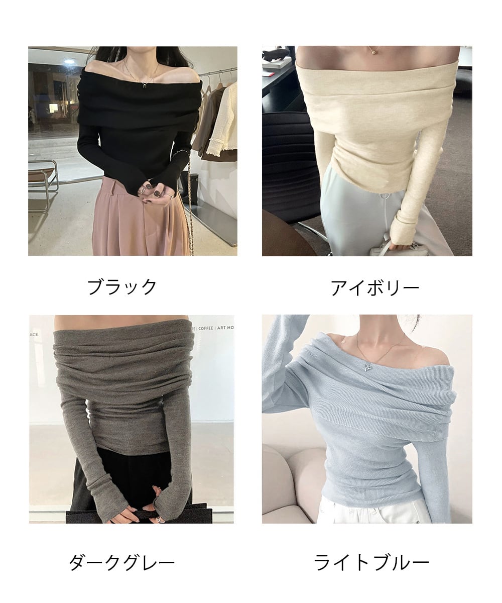 トレンドの折り返しデザインを取り入れたオフショルダーで、ヘルシーに肌見せできるニットトップス。