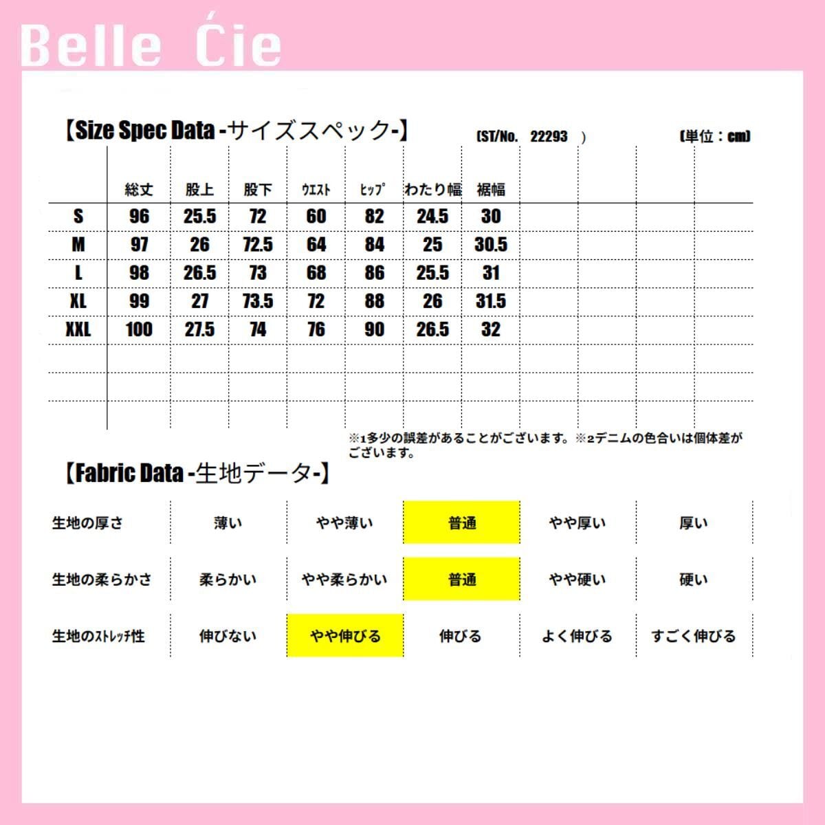 【S】:総丈96 股上25.5 股下72 ウエスト60 ヒップ82 わたり幅24.5 裾幅30