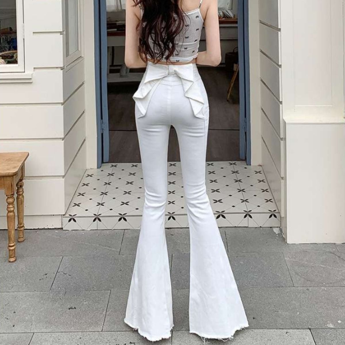 -美脚&脚長見え!リボン付きハイウエストフレアデニム