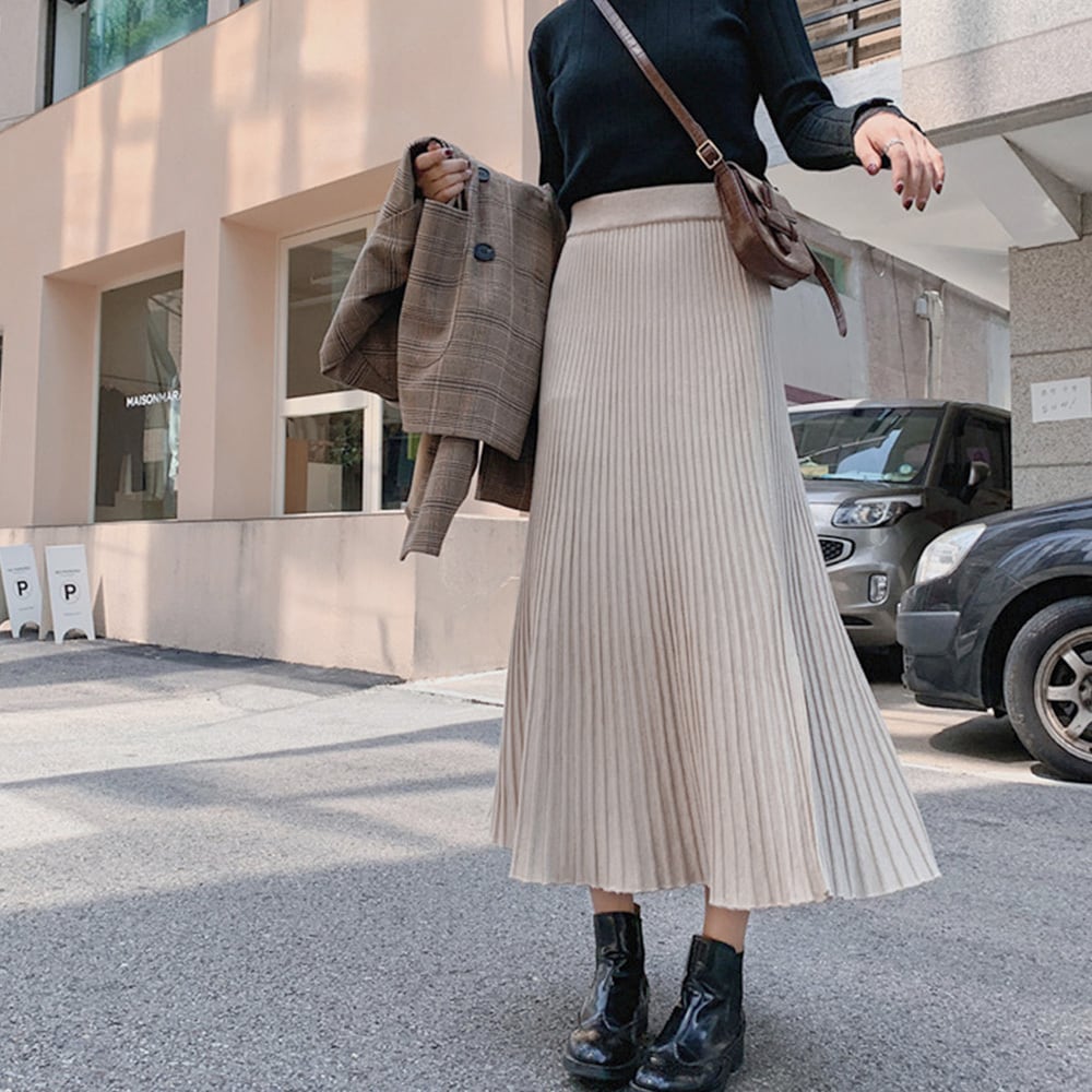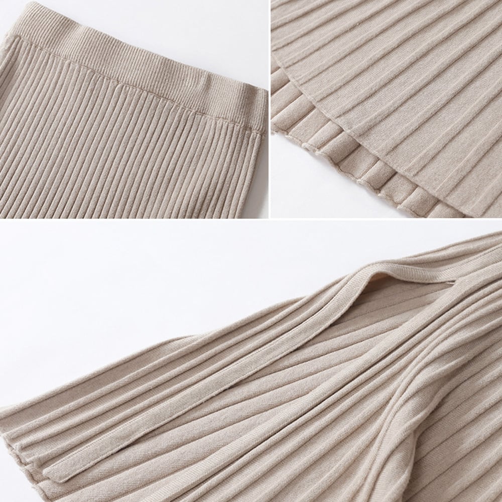 洗練されたデザインで秋冬を楽しむ、大人の女性に最適なニットスカート。高めのハイウエストがスタイルアップ効果を持ち、フレアシルエットが女性らしいラインを際立たせます。スリット入りのAラインプリーツデザインが、さりげないお洒落を演出し、どんなコーディネートにも合わせやすいアイテムです。