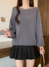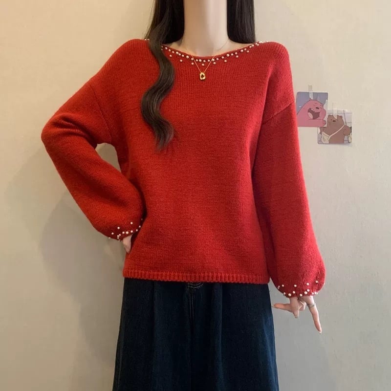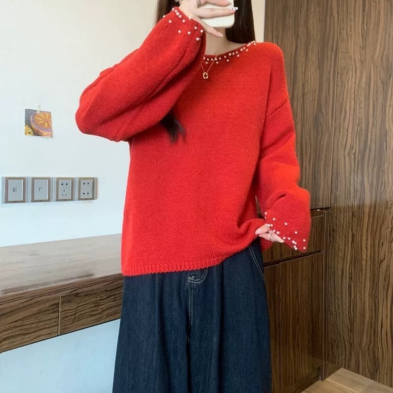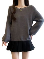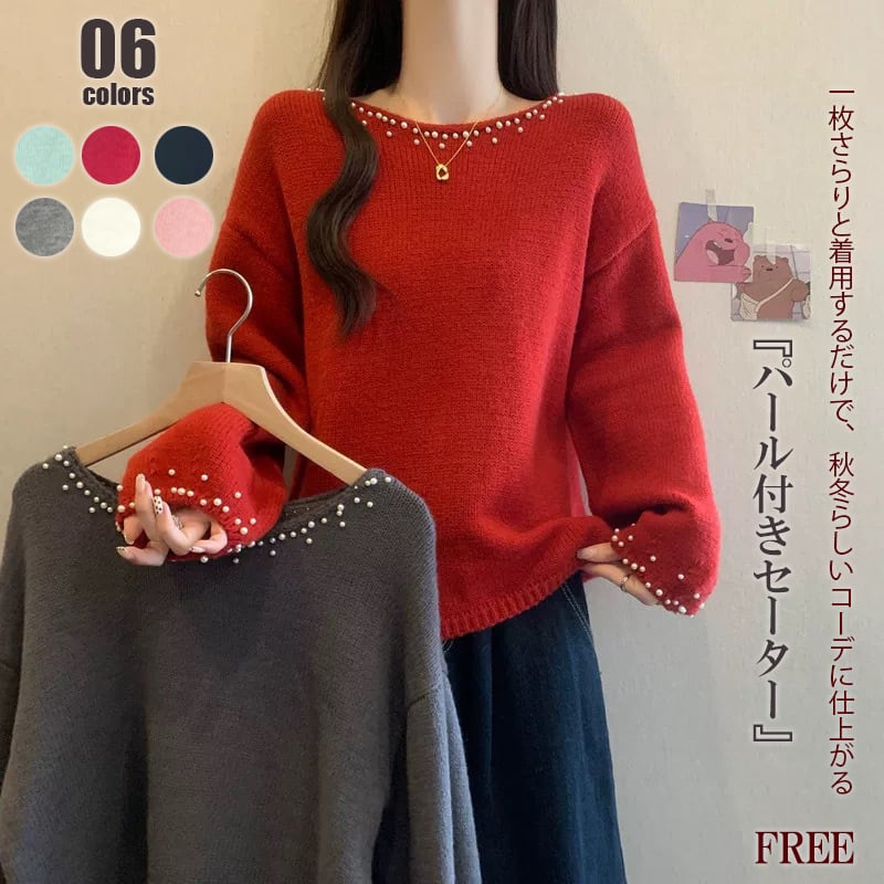 レディース なめらか ゆるセーター ラウンドネック 着痩せ プルオーバー パール付き トップス おしゃれ | Fashionshop Kuuu571 |StylishでおしゃれなFashion好きな人達へ