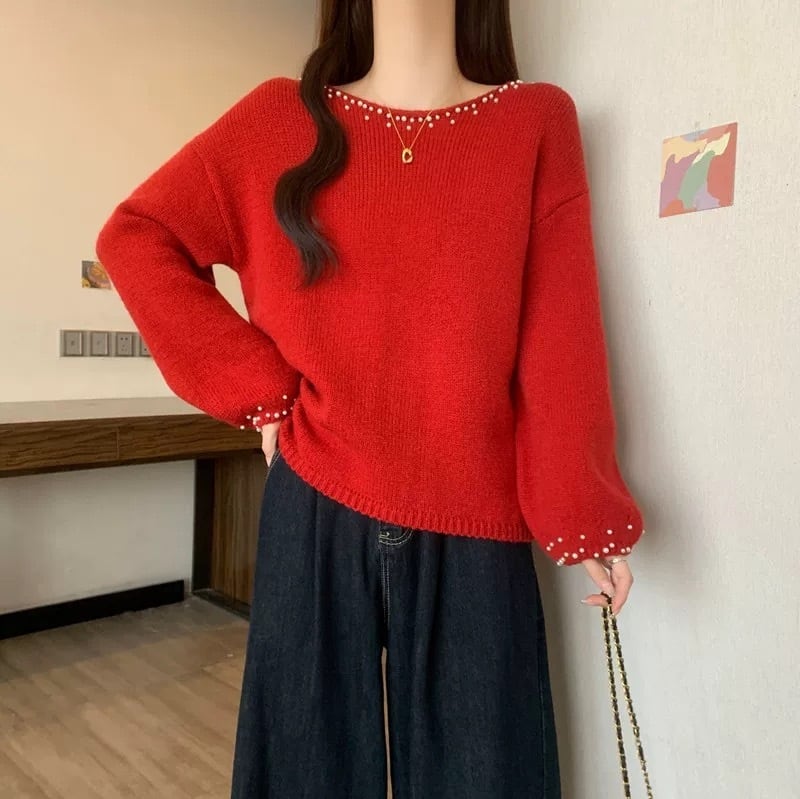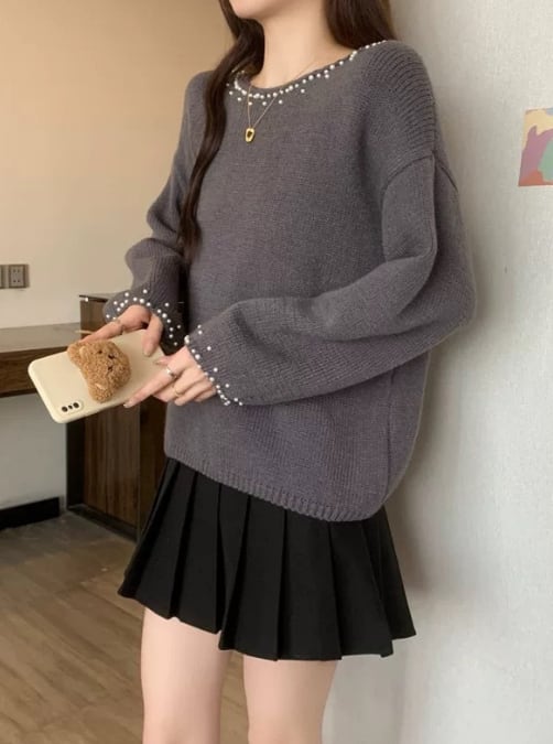 一枚さらりと着用するだけで、秋冬らしいコーデに仕上がる上品なパール付きセーター