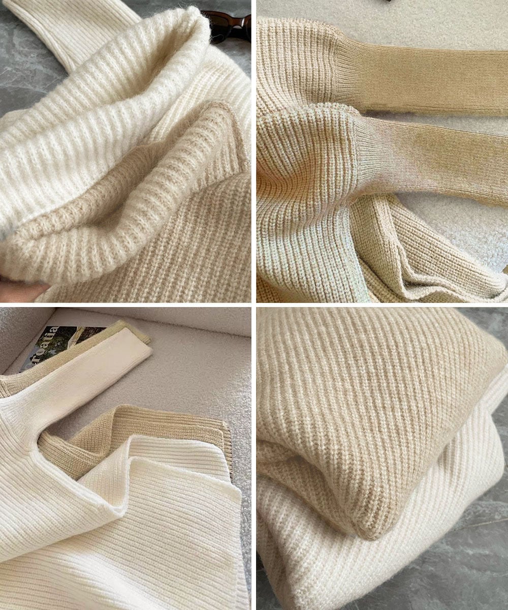 ◇2. 不規則な編み模様が、シンプルなスタイルにアクセントを加え、目を引くスタイリングを演出します。