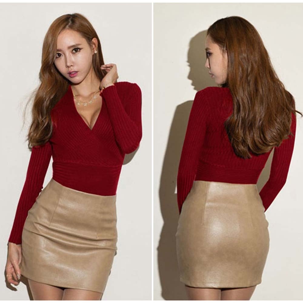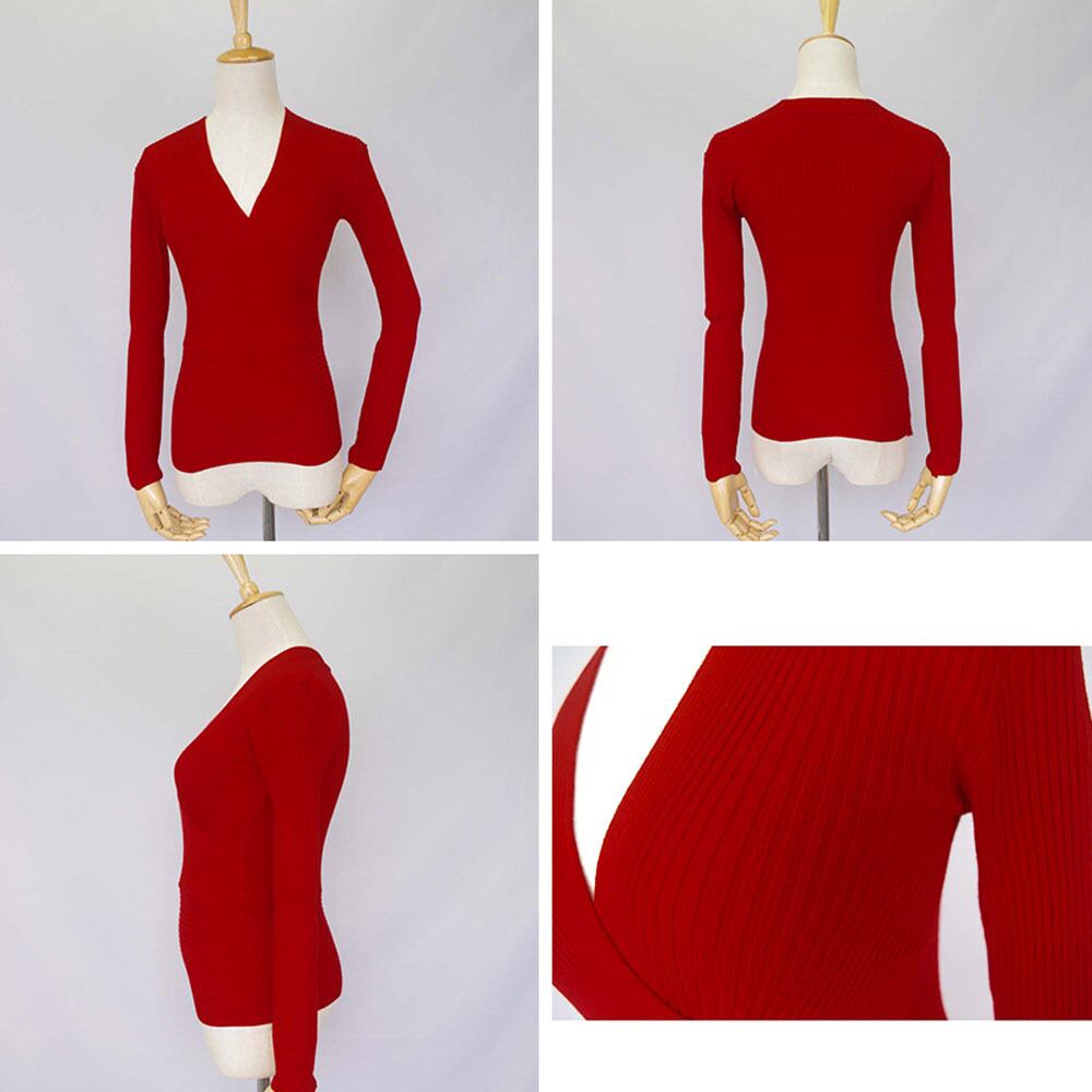 ボディラインに美しくフィットするストレッチ素材、Vネックが胸元をセクシーに演出