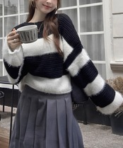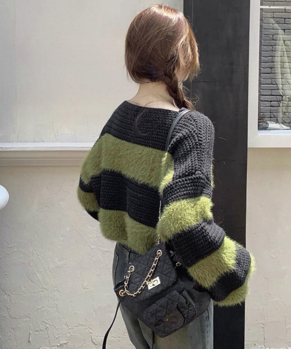 ふわふわのファー素材とざっくり編みを組み合わせたバイカラーニット。