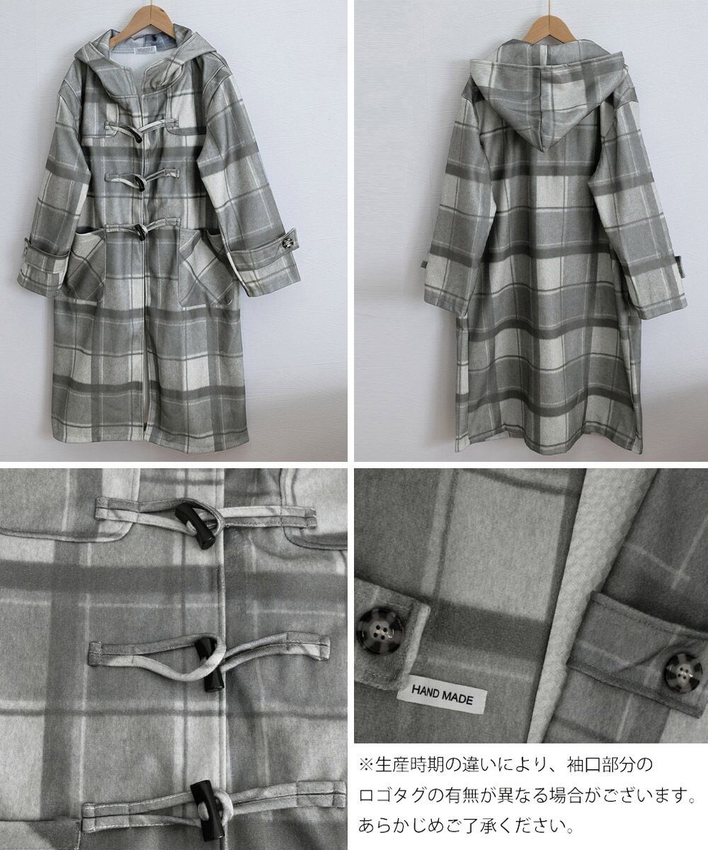 チェック柄とトグルボタンが印象的な、フード付きロングコート。
