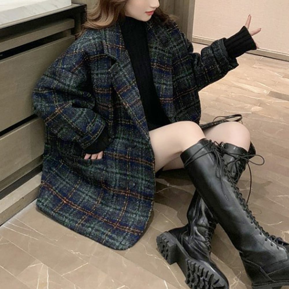 存在感のある大きめのチェック柄が目を惹く、ミドル丈のコート