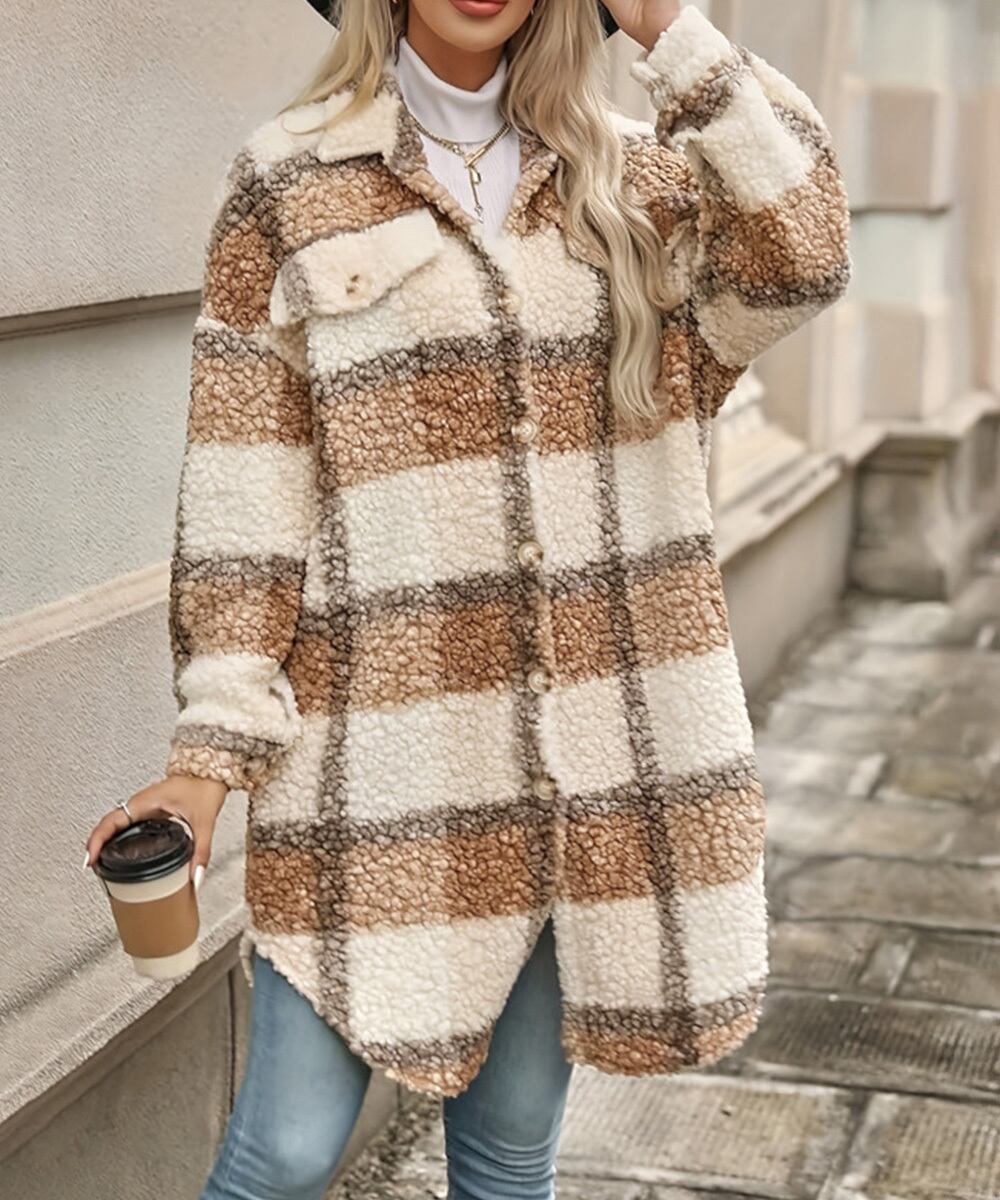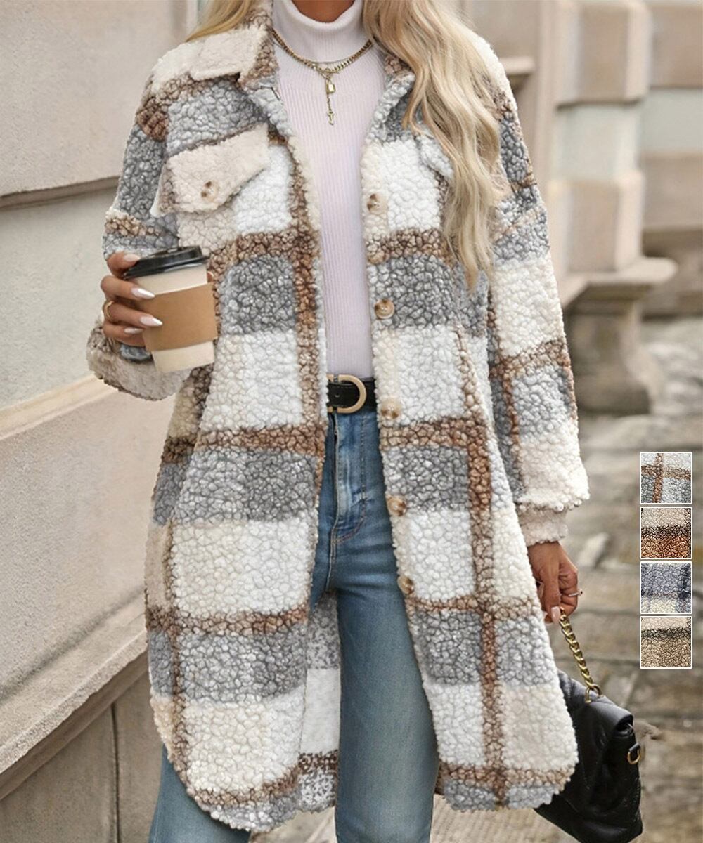 チェック柄のもこもこボアが目を引くロングシャツジャケット。