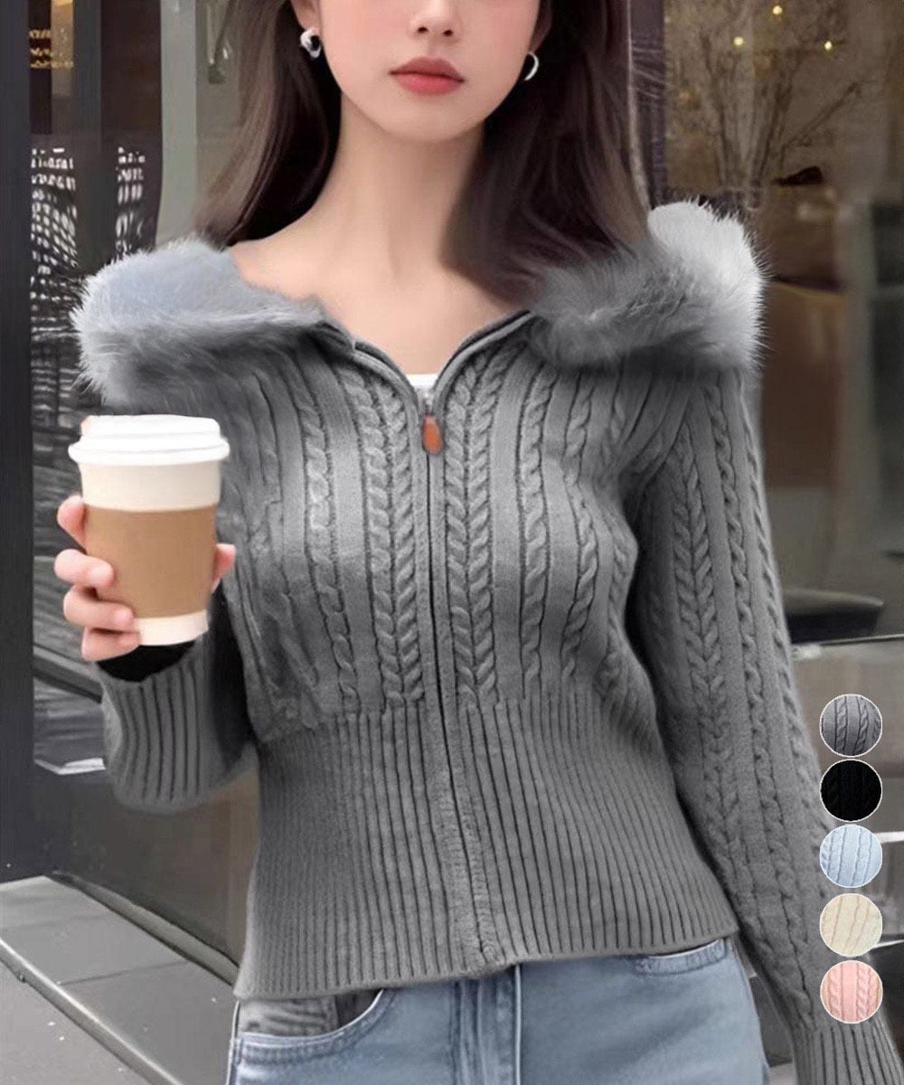 たっぷりとしたケーブル編みが魅力的で、ニット素材の柔らかさが着心地を向上させます。ジップタイプの前開きなので、脱ぎ着も簡単で、カジュアルな日常使いからお出かけまで幅広く活躍します。デニムやスカートとの相性も抜群で、春先まで使い回せるのが嬉しいポイントです!