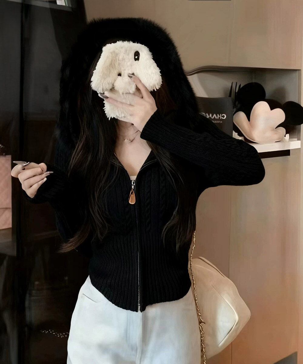 「フード付きケーブル編みニットカーディガン」は、秋冬のスタイルに欠かせない、おしゃれさと暖かさを兼ね備えたアイテムです!ふわふわのファーフードとリブニット素材を組み合わせたデザインは、大人かわいい印象を与え、さまざまなコーディネートにマッチします。