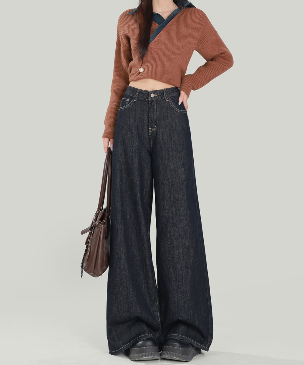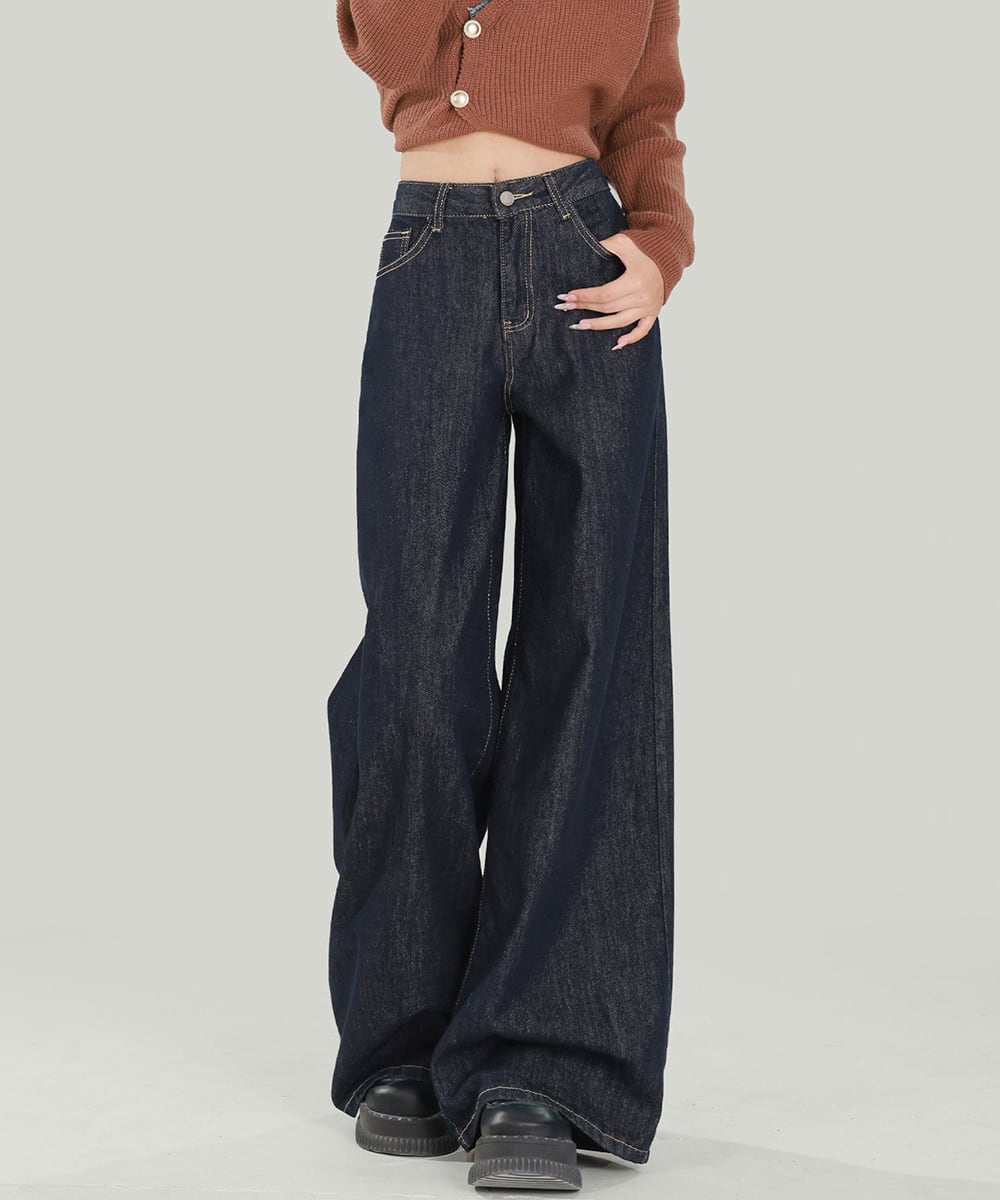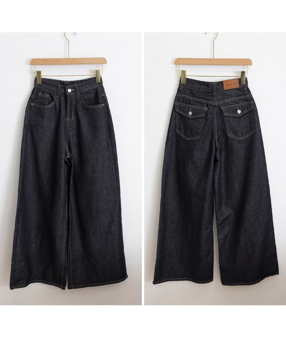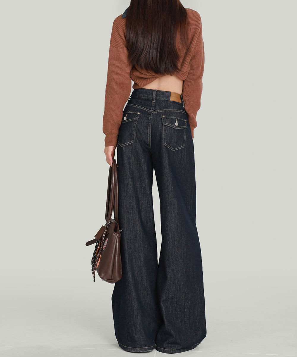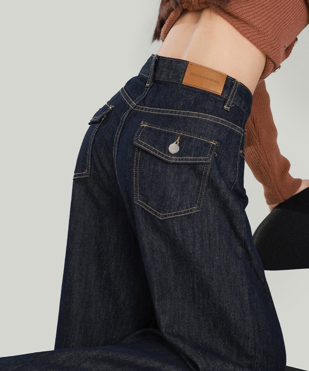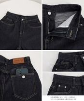 ハイウエストデザインは、スタイルアップ効果抜群で、美脚・脚長効果も期待できます。レトロ風のデザインに加え、ポイントのレザーパッチがアクセントとなり、韓国風のトレンドを感じさせる一着です。シンプルなトップスと合わせるだけで、オシャレなカジュアルスタイルが完成するのが嬉しいポイントです!
