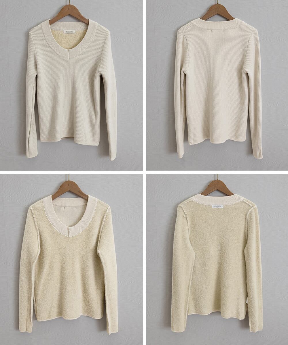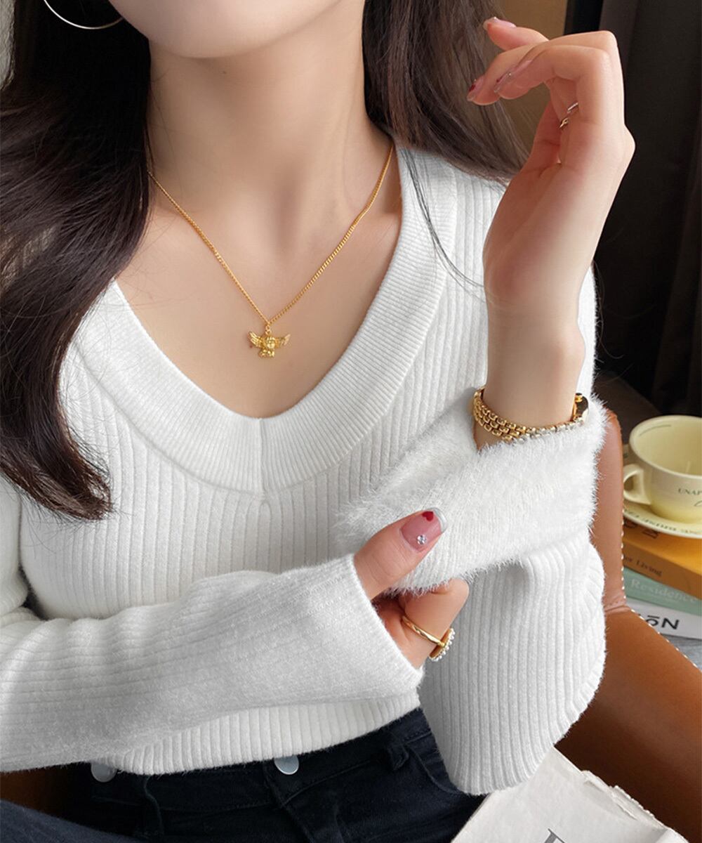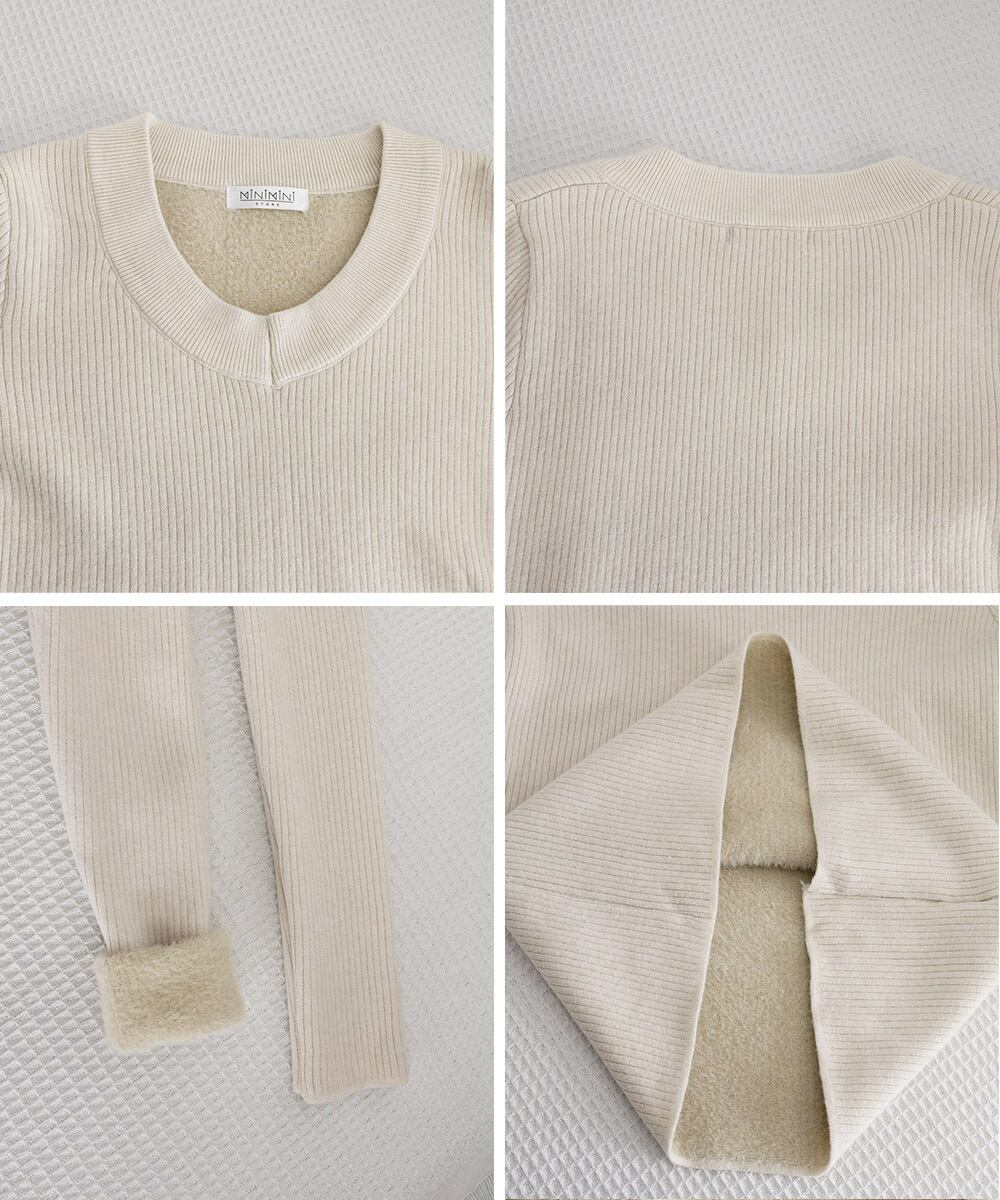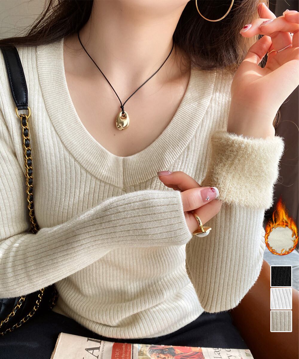 柔らかなリブ編みが魅力の、Vネック長袖あったか裏起毛ニットプルオーバー。