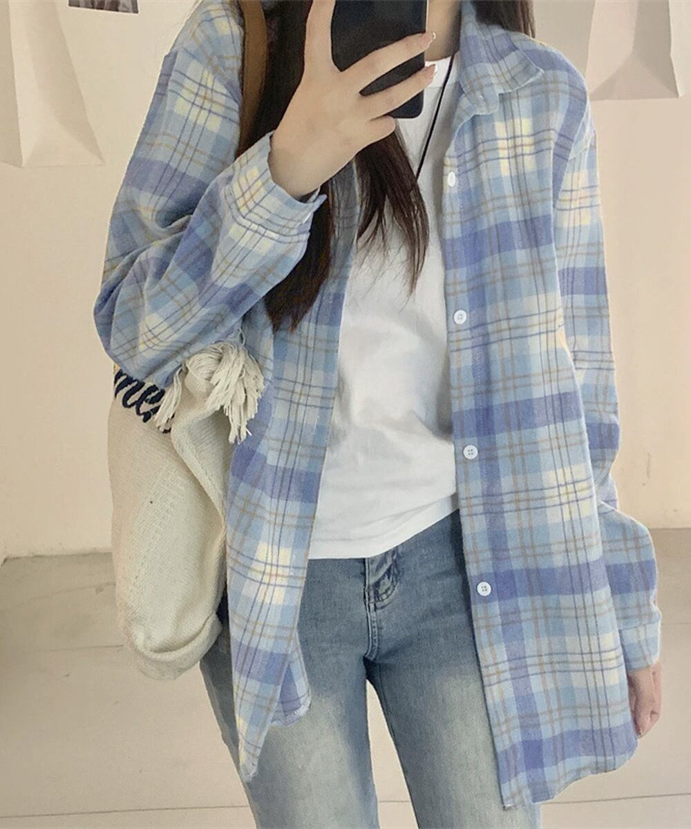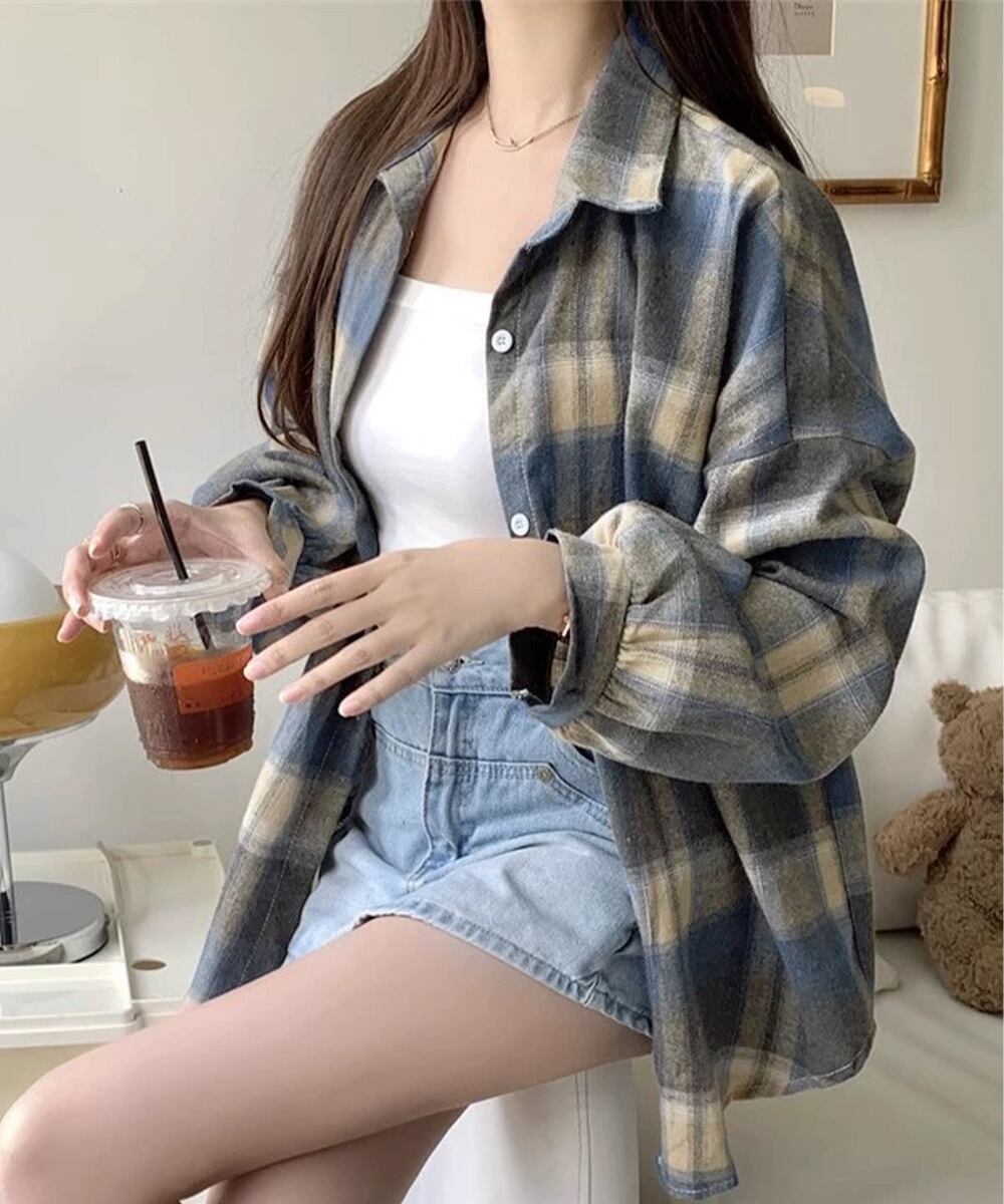 韓国風レトロデザインのオーバーサイズチェックシャツ。