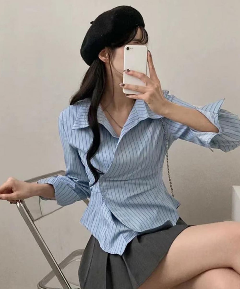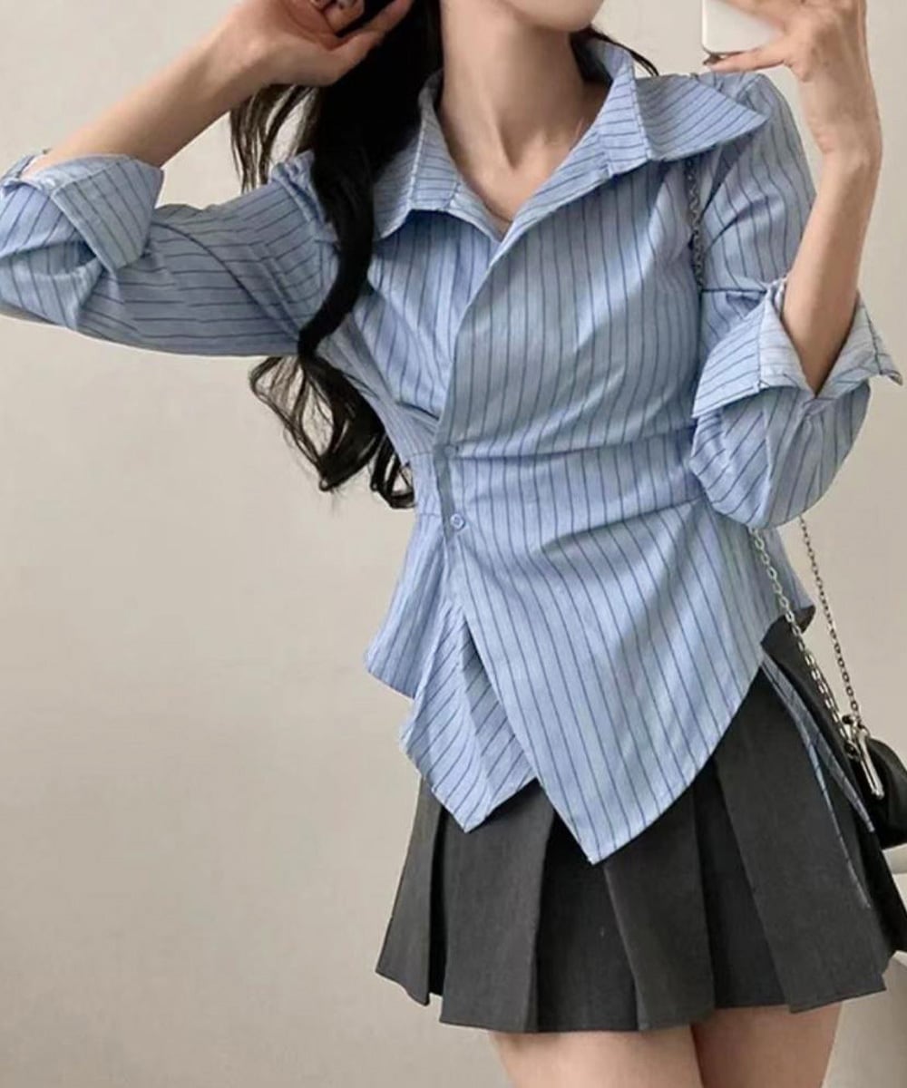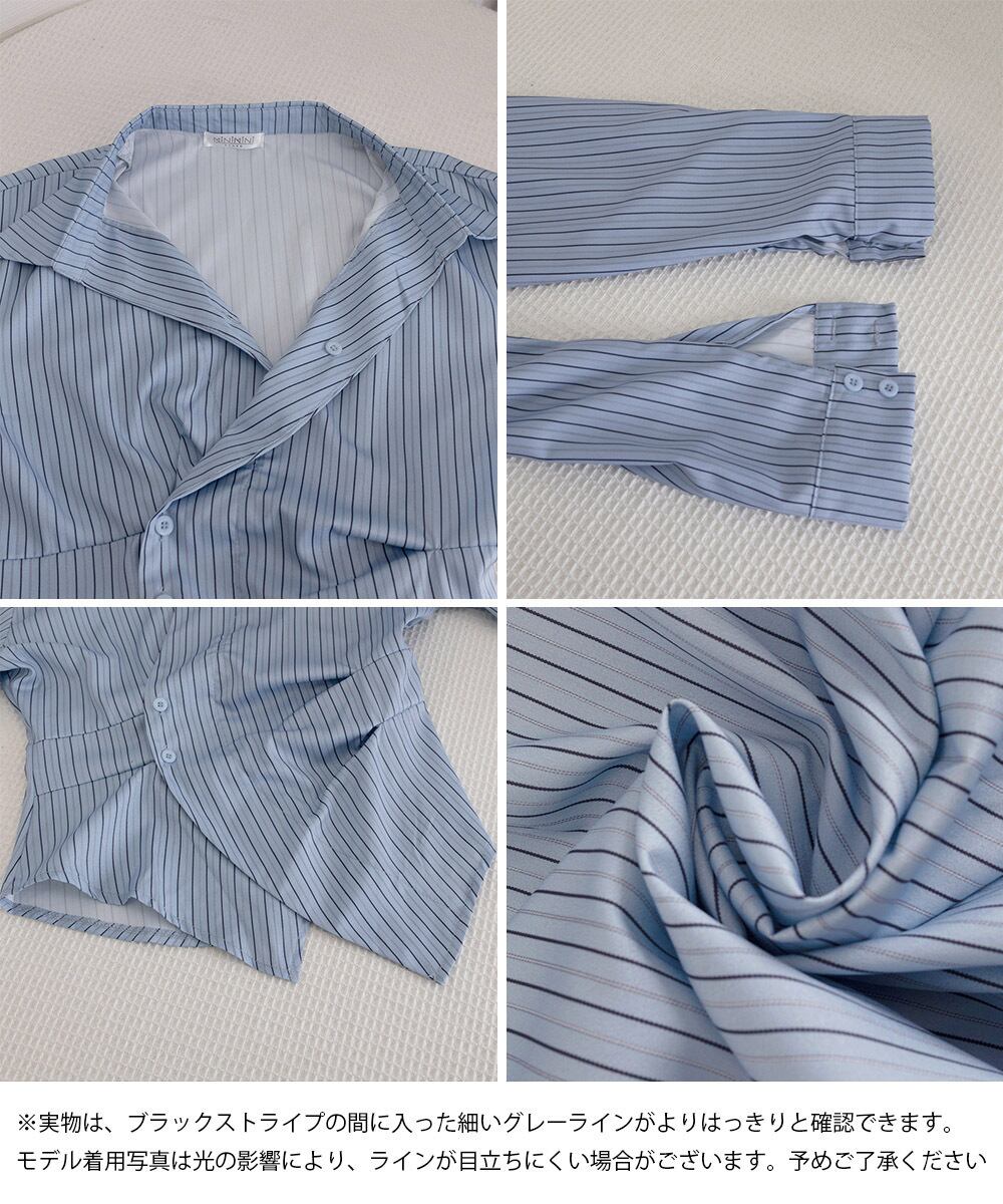 この長袖ラップブラウスは、エレガントなストライプ柄が特徴。ウエストマークとペプラムシルエットが美しいラインを演出し、カジュアルからきれいめスタイルまで幅広く対応します。オフィスやお出かけ、女子会など、多様なシーンで大活躍のアイテムです!