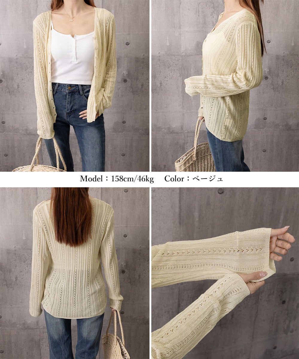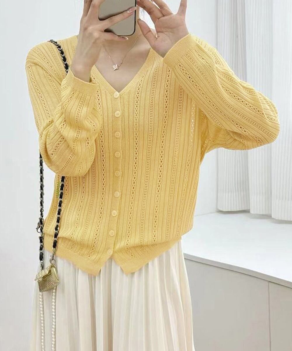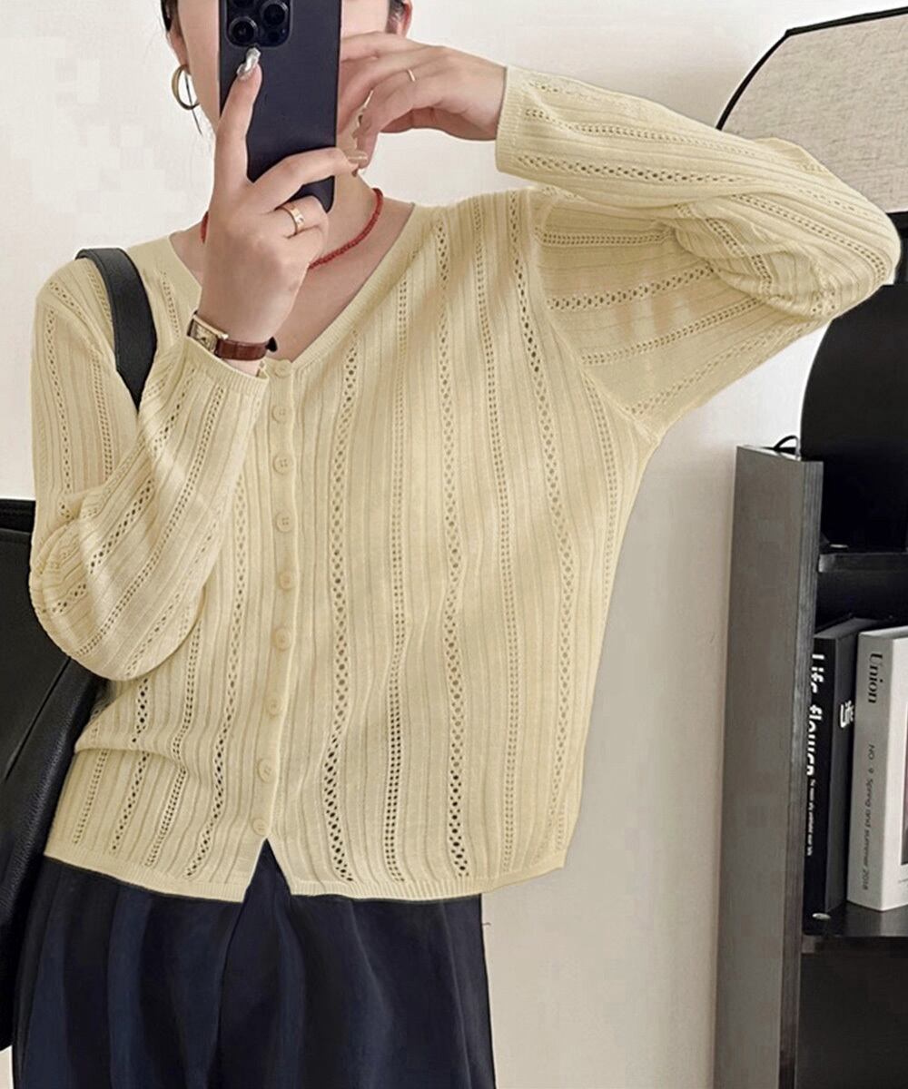 この針抜きニットカーディガンは、春夏シーズンにぴったりの軽やかなデザインのアイテムです。