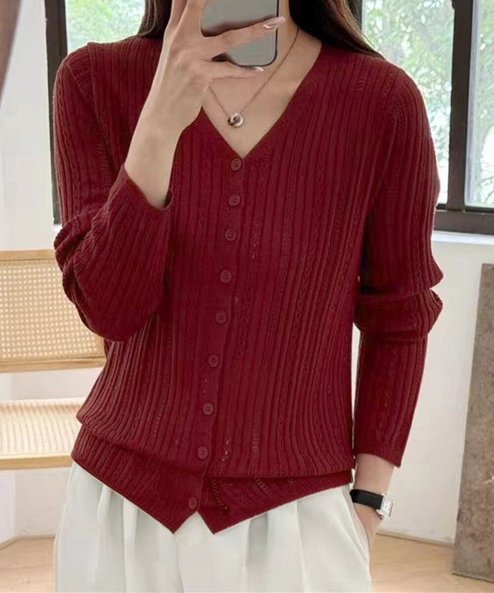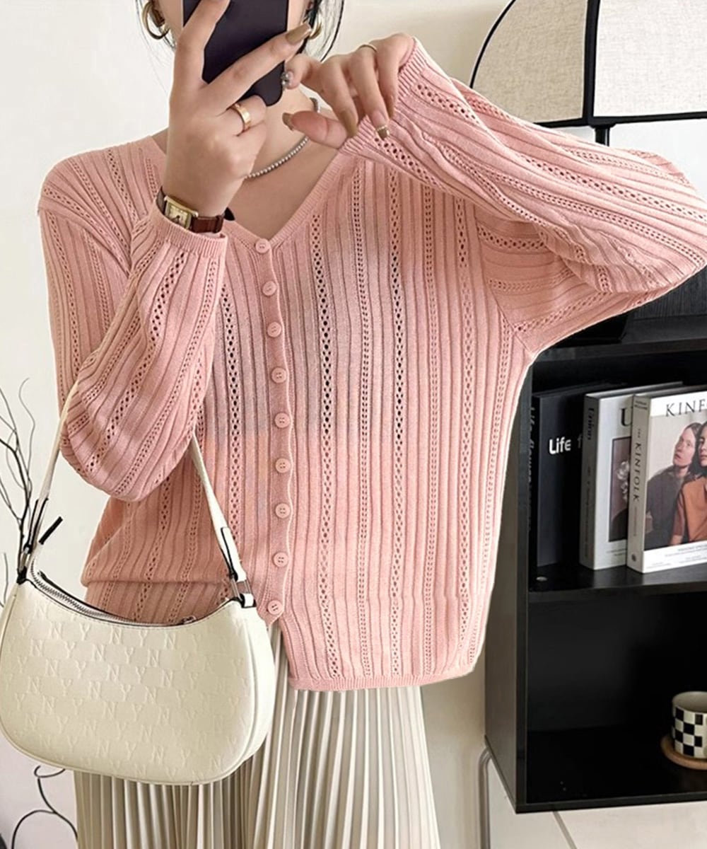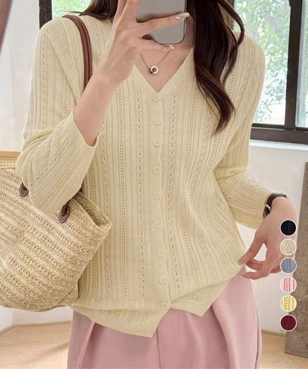 美しい縦ラインが際立つ、透かし編みデザインのVネックニットカーディガン。