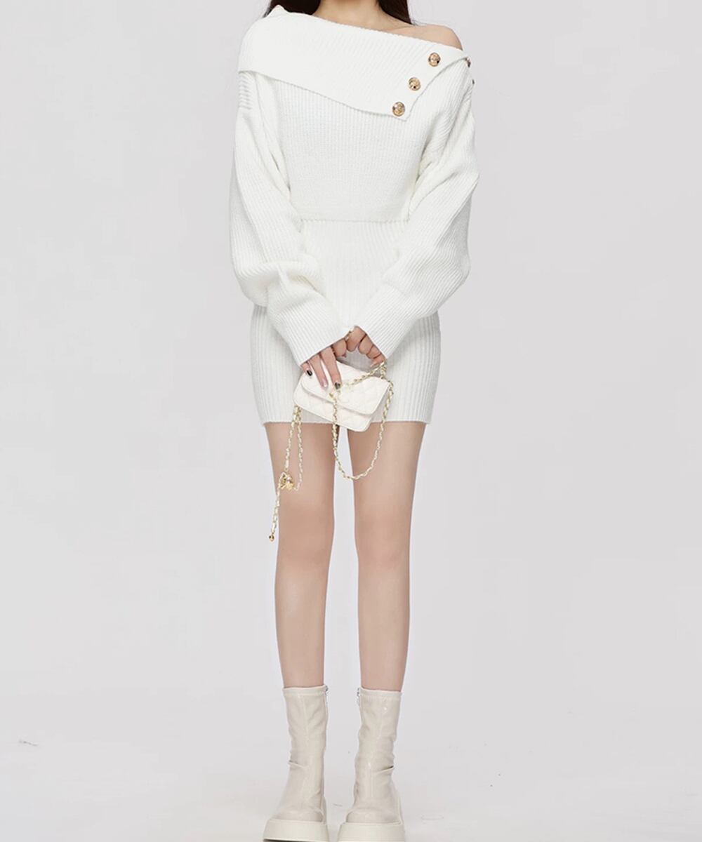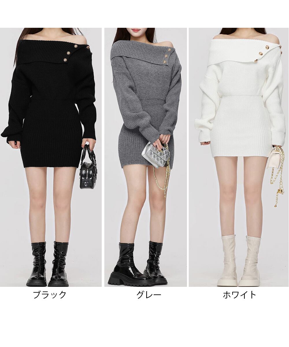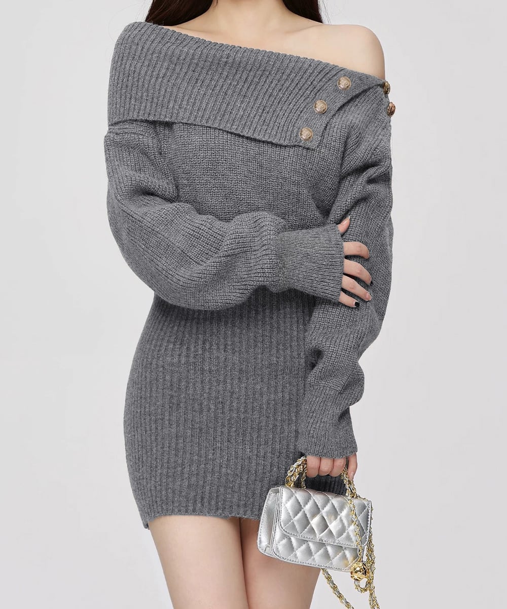 トレンドのオフショルダーに金ボタンデザインを施した、上品な雰囲気漂うニットワンピース。