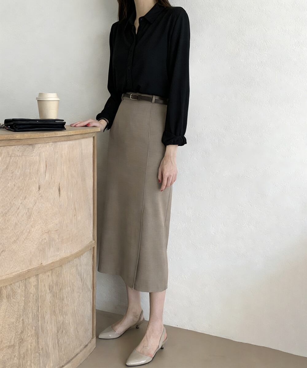 とろみのある素材が女性らしい落ち感を演出し、オフィスでもきれいめに着こなせる。