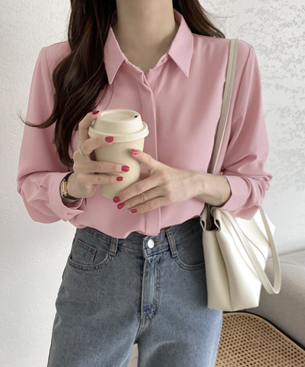 このシャツブラウスは、スカートやデニムなど、さまざまなボトムスに合わせやすく、どんなシーンでも活用できるところが魅力です。軽やかな着心地で、春秋シーズンの必須アイテムとして重宝します!レイヤードスタイルにも最適で、アウターやカーディガンとの相性も抜群です。