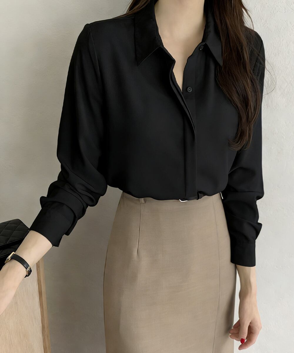 このシャツブラウス 隠しボタンは、春から秋まで活躍する上品で快適な一着です。