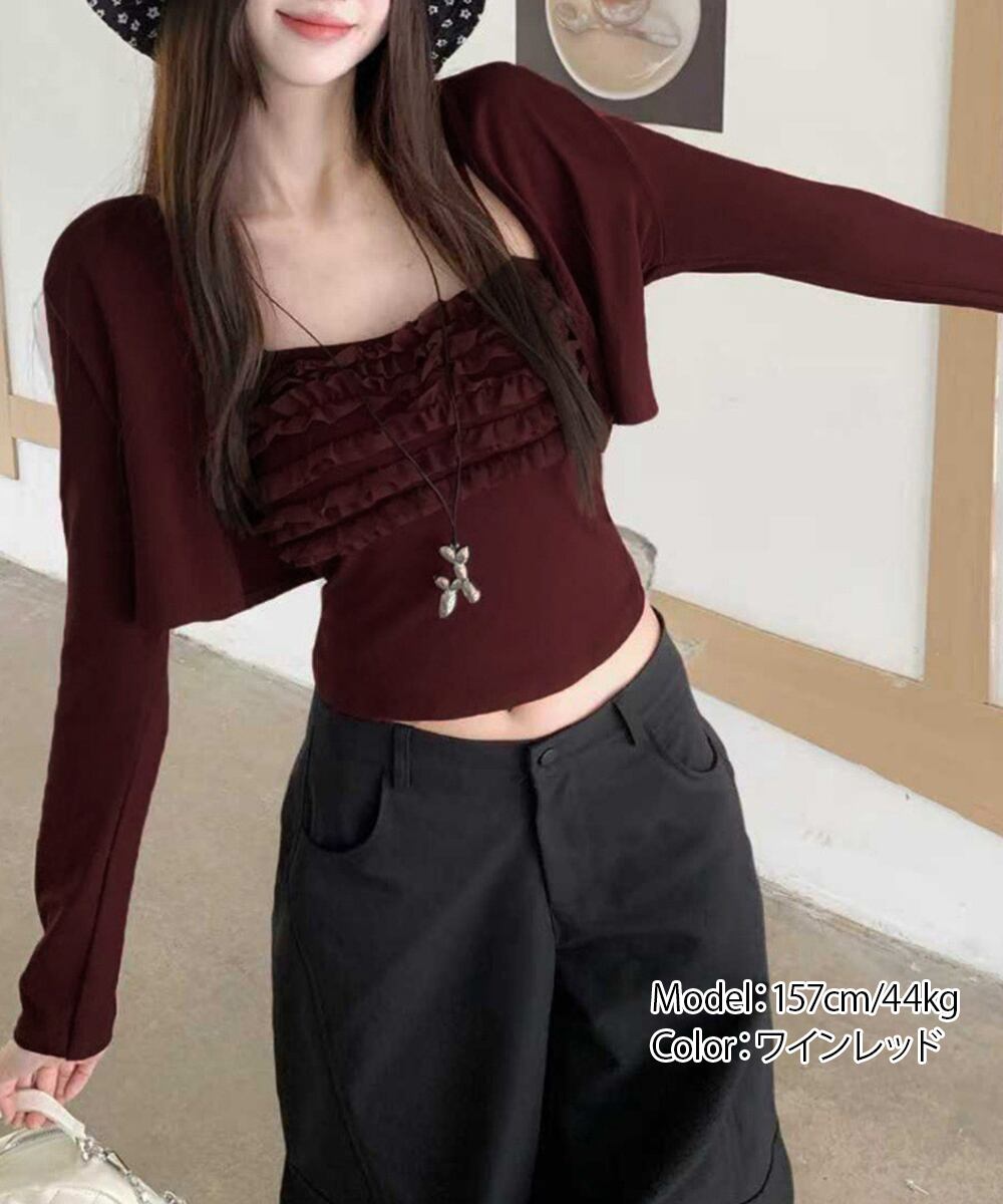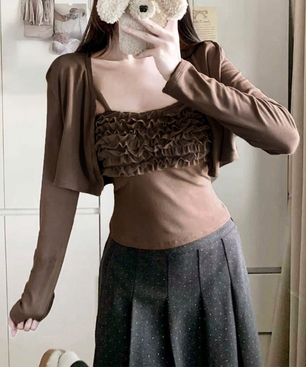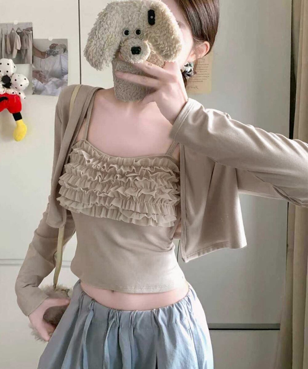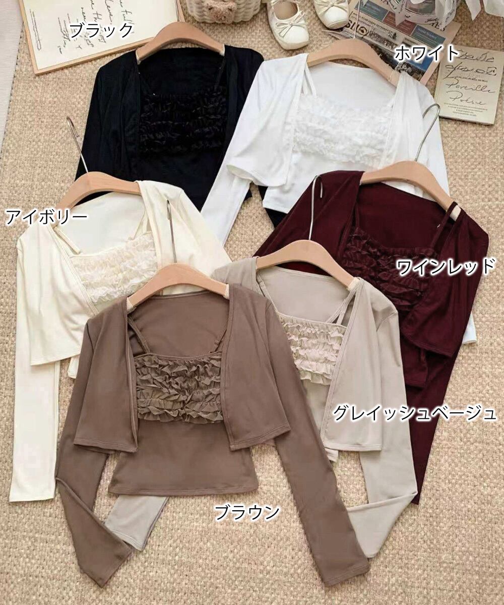 フリルが可愛いキャミソールとショート丈カーディガンのセット。