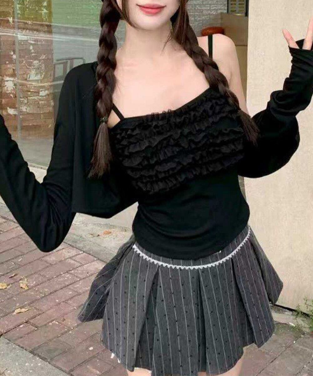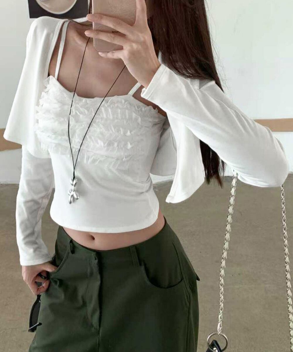 このキャミソールカーディガンアンサンブルは、春夏にぴったりのアイテム。フリル付きのキャミソールは女性らしさを引き立て、カップ付きで安心感も実現しています。おしゃれなショートカーディガンとの組み合わせで、特別な日やカジュアルなデートにも最適です!軽やかなデザインが、季節感を楽しませます。