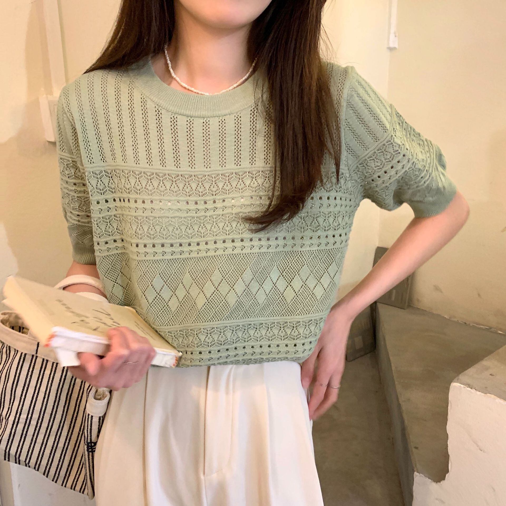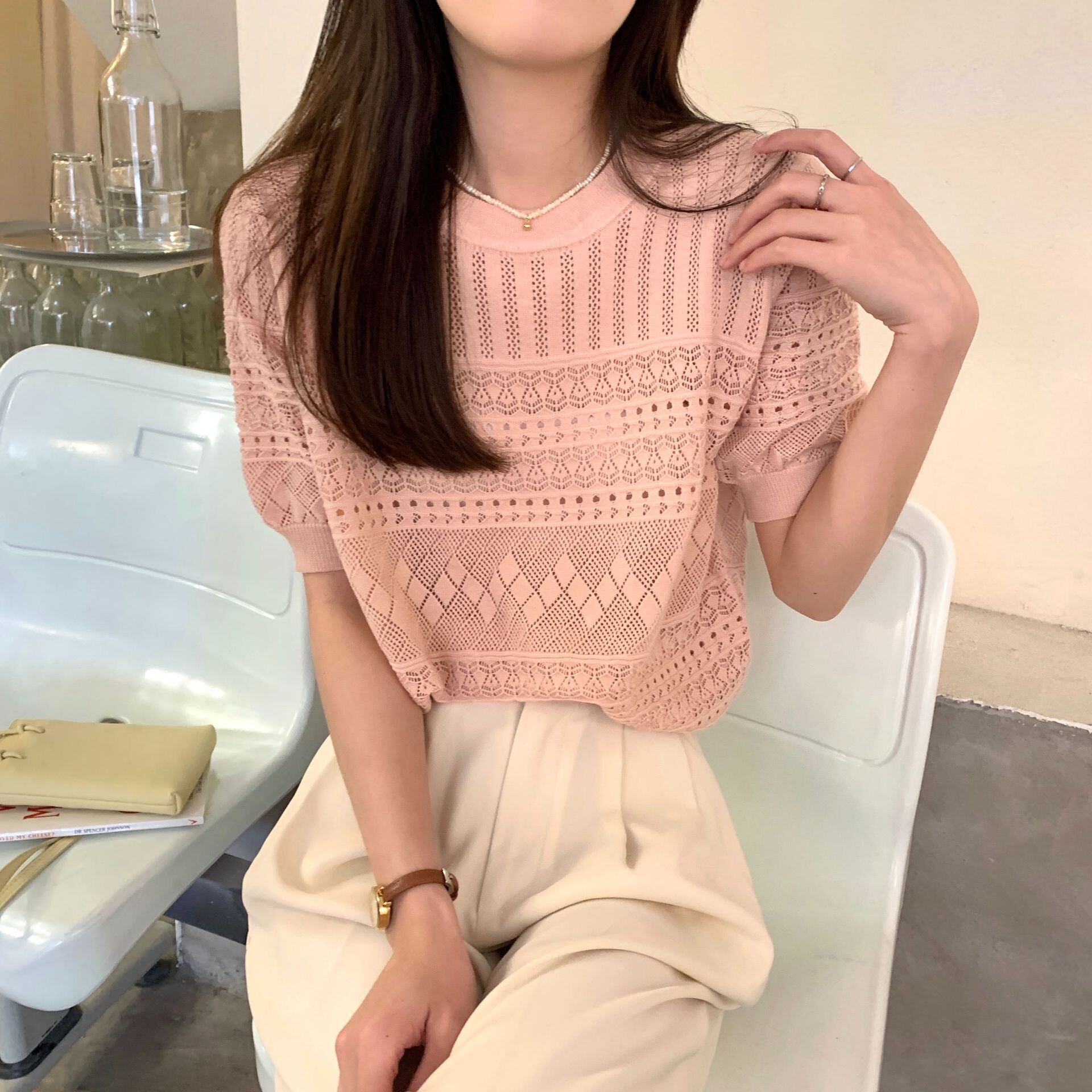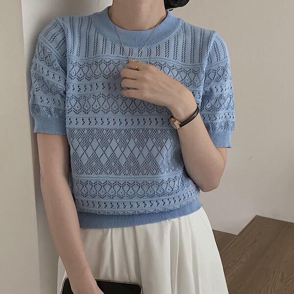\2026春夏新作!/ 透かし編み メッシュニット 半袖 カギ編み サマーニット