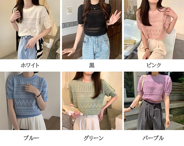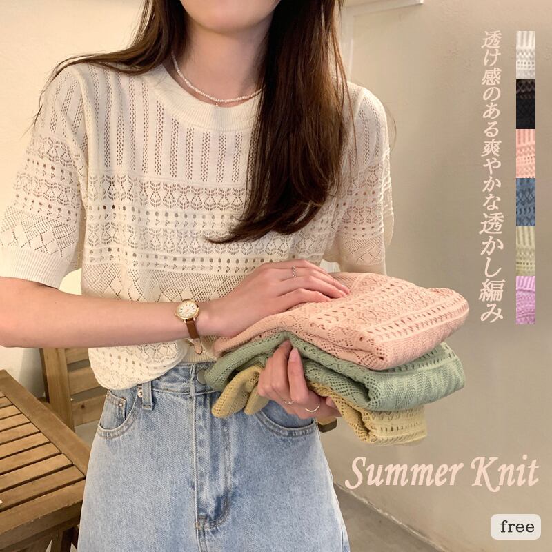 新作 透かし編み メッシュニット 半袖 カギ編み 透け感 抜け感 サマーニット
