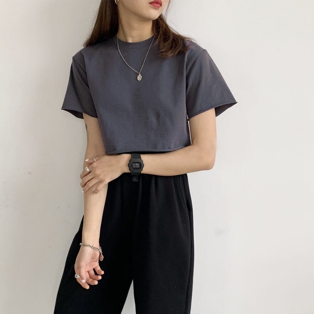 へそ出し トップス 韓国 着やせ ゆったり 無地 セクシー 丸首 カジュアル