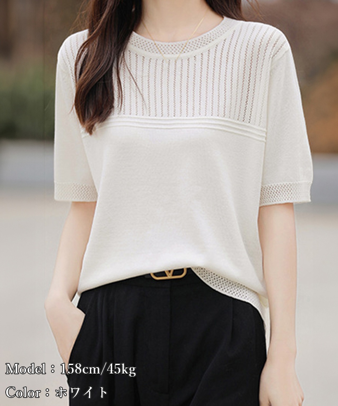 レディース オフィスカジュアル 薄手プルオーバー 五分袖 透かし編み切り替え きれいめ ニットソー 無地 春秋夏トップス