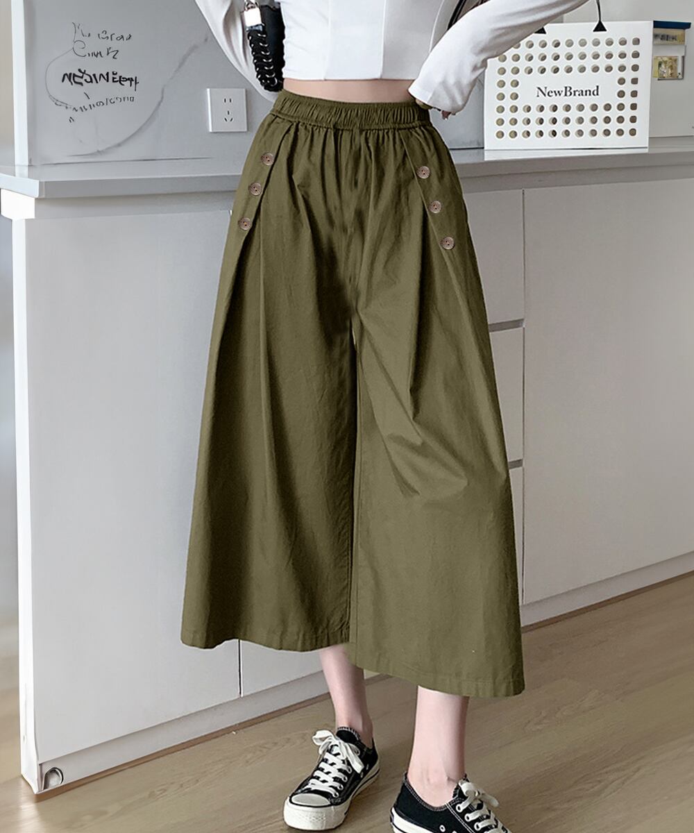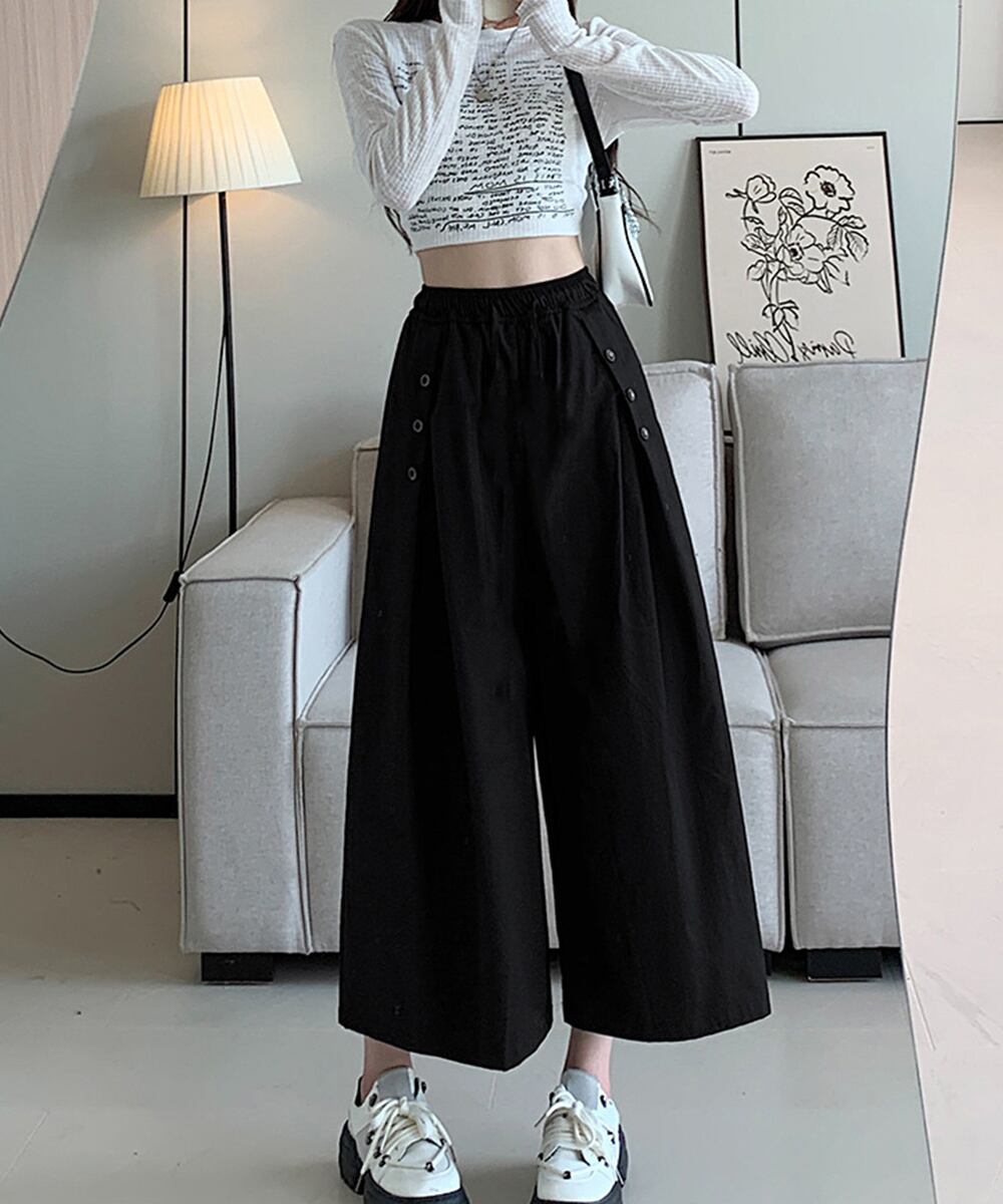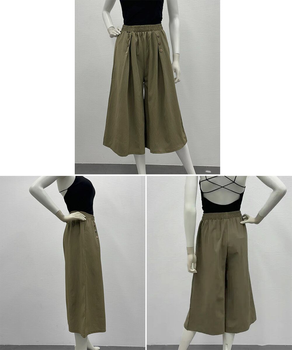 安心感のあるハイウエストにボタンをリズミカルに並べ、デザインアクセントに