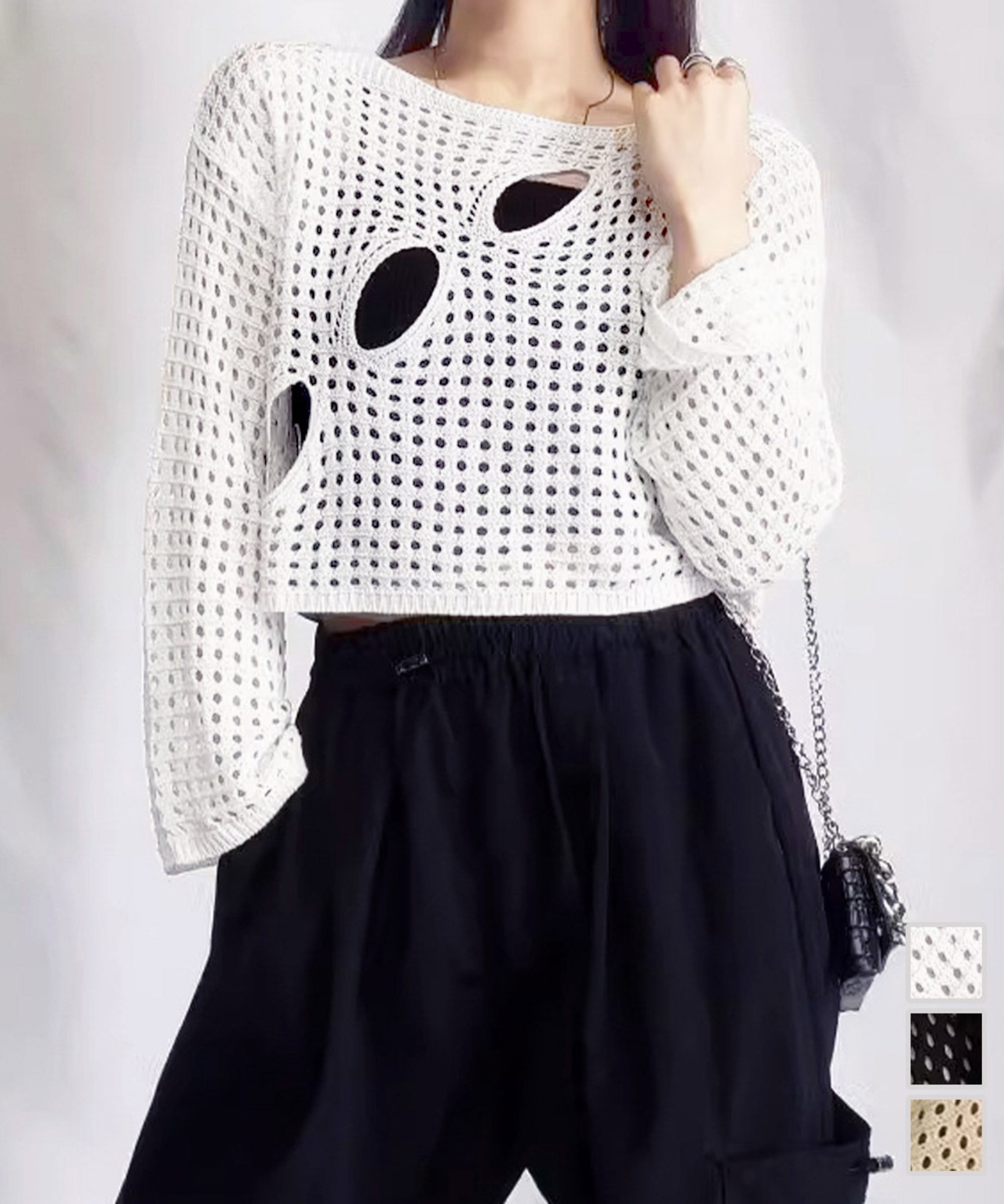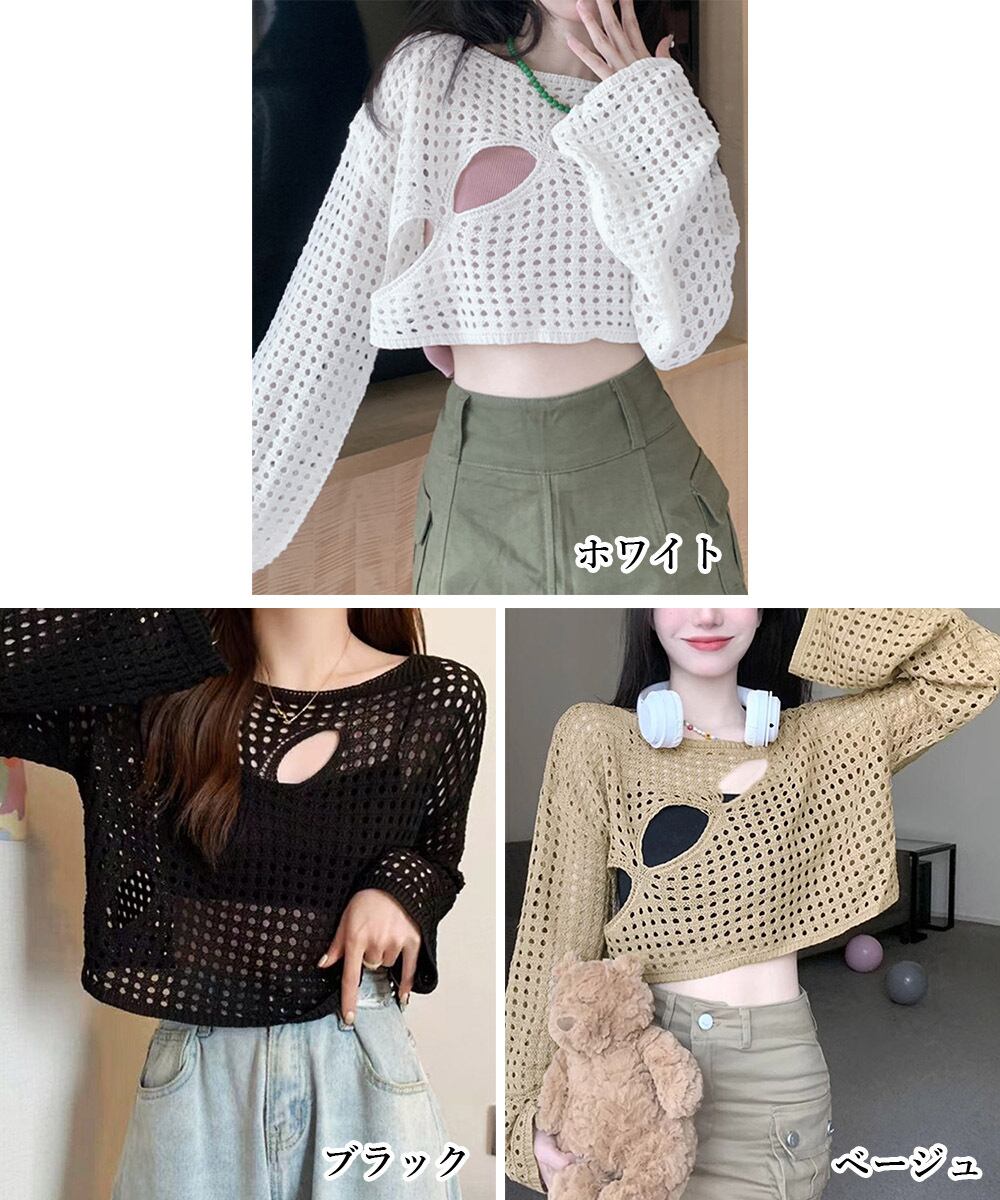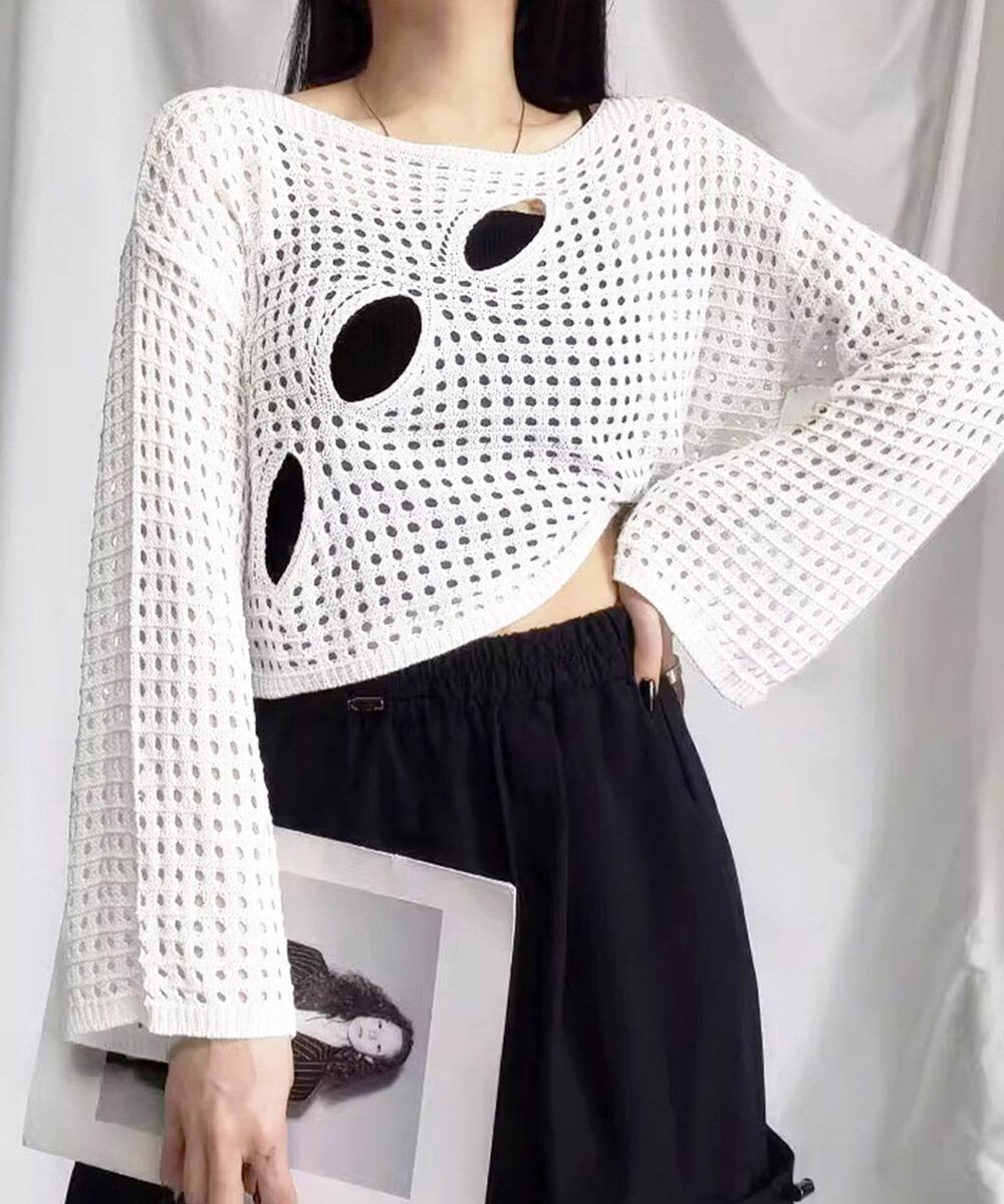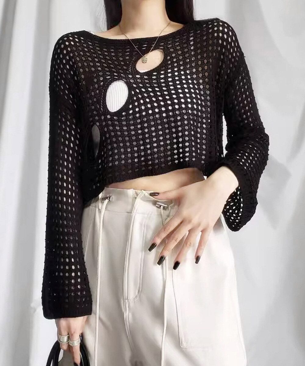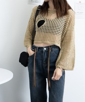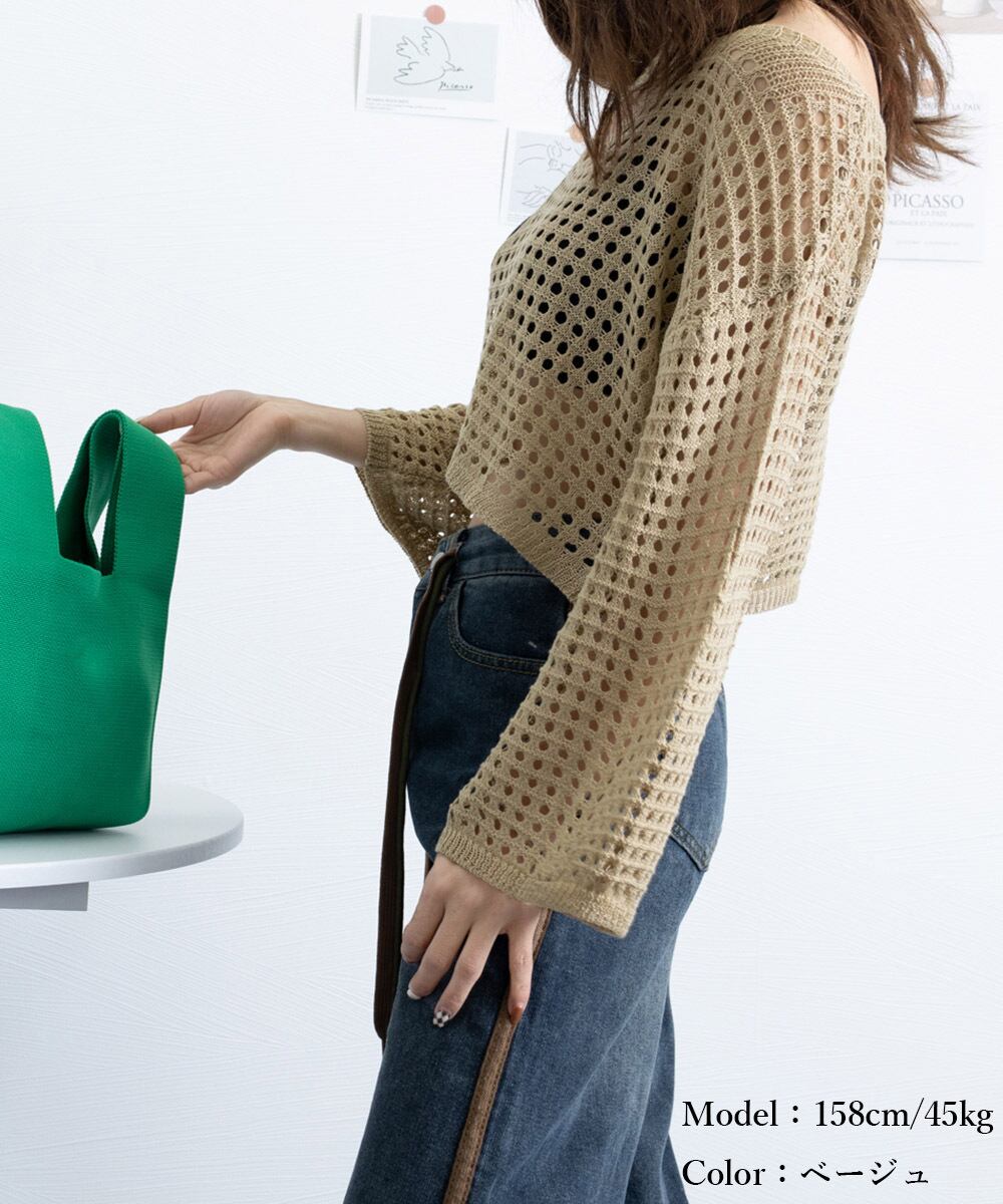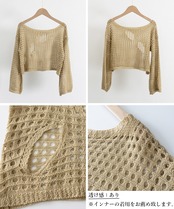 メッシュ編みが涼しげで軽やかな印象のショート丈サマーニット