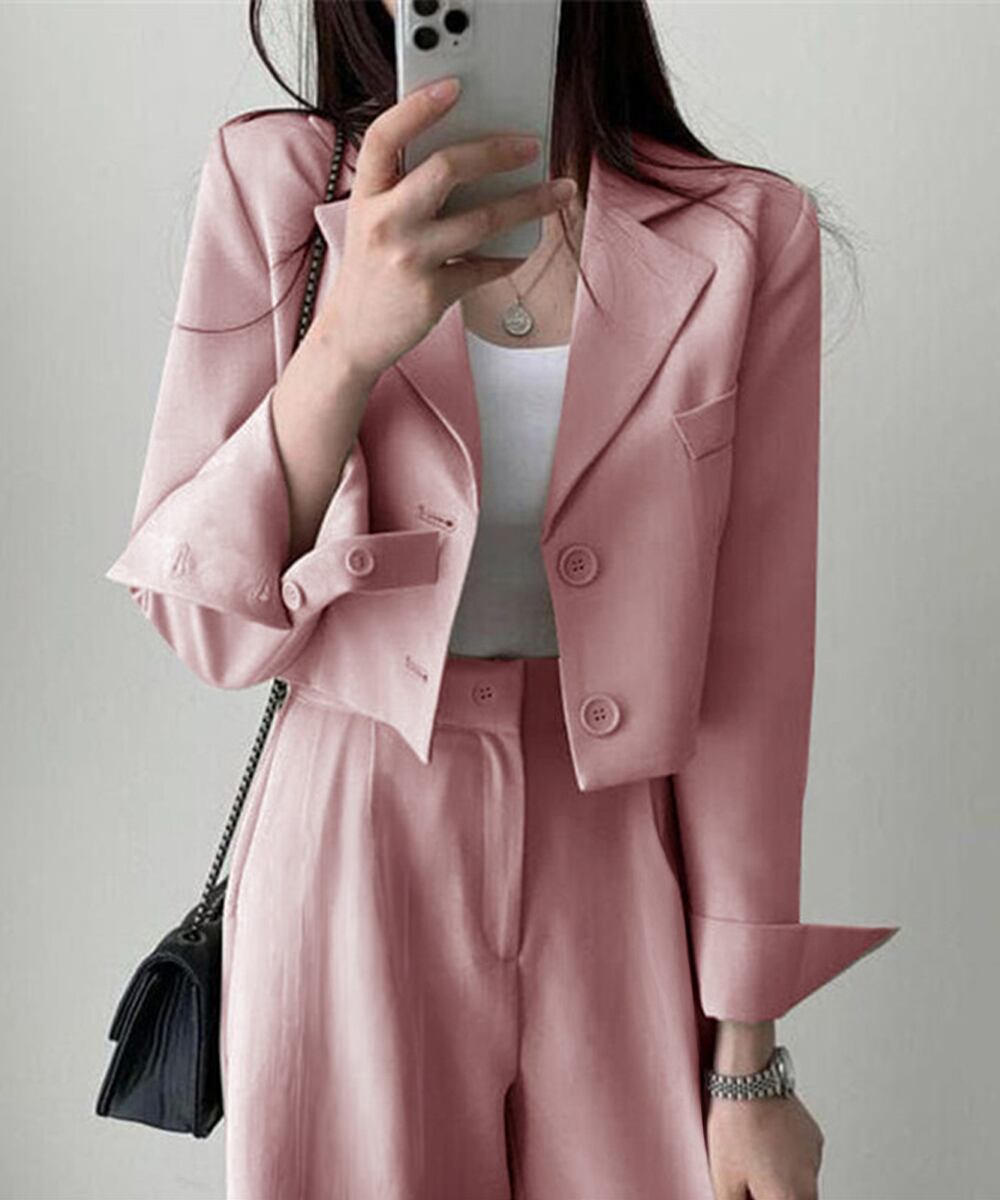 クロップドジャケットとハイウエストパンツの組み合わせが、上品でスタイリッシュなシルエットを演出