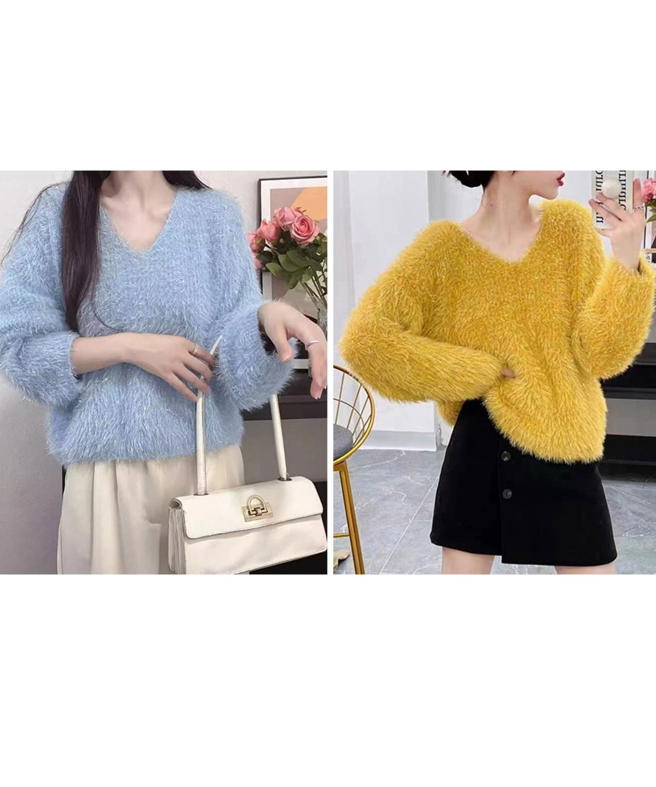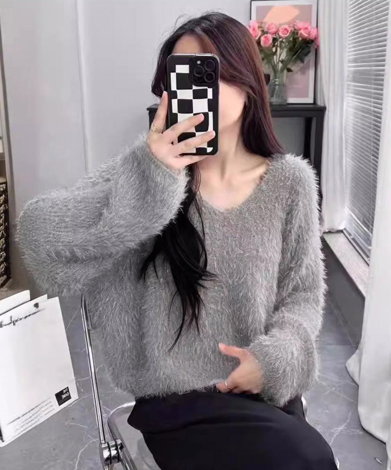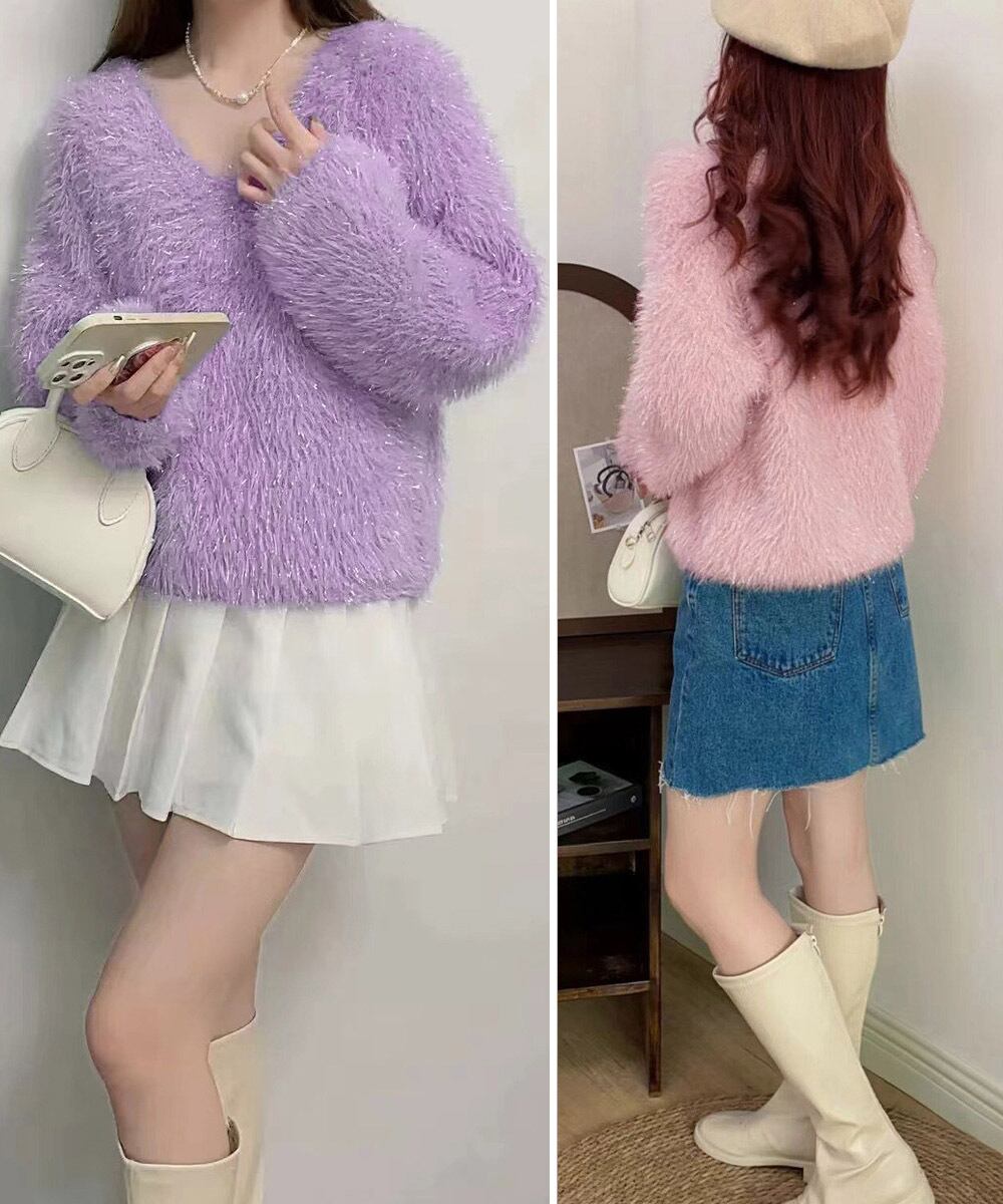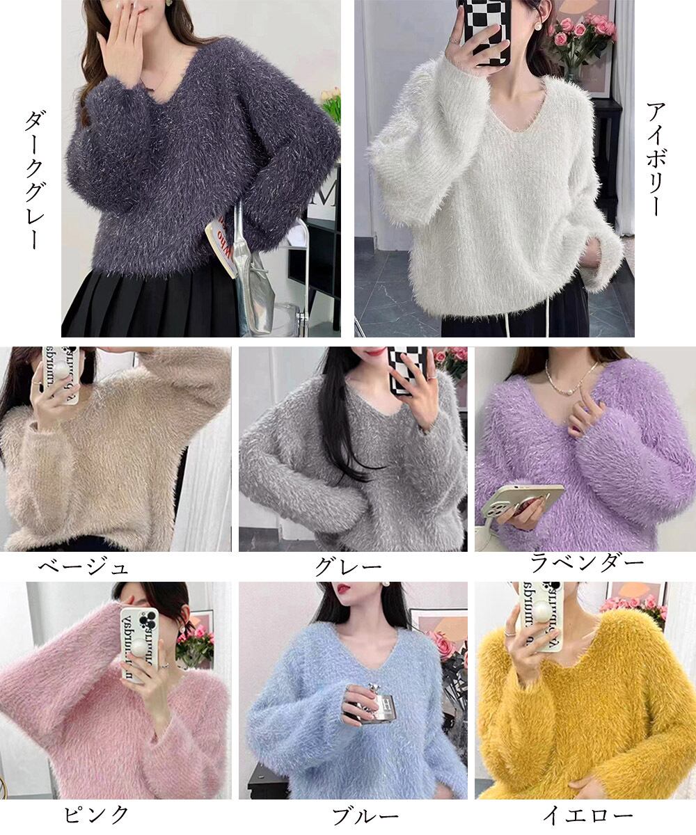 レディース ふわふわ モヘアニットプルオーバー 大人可愛いシャギーセーター 韓国風きらきらトップス キレイめニット 無地
